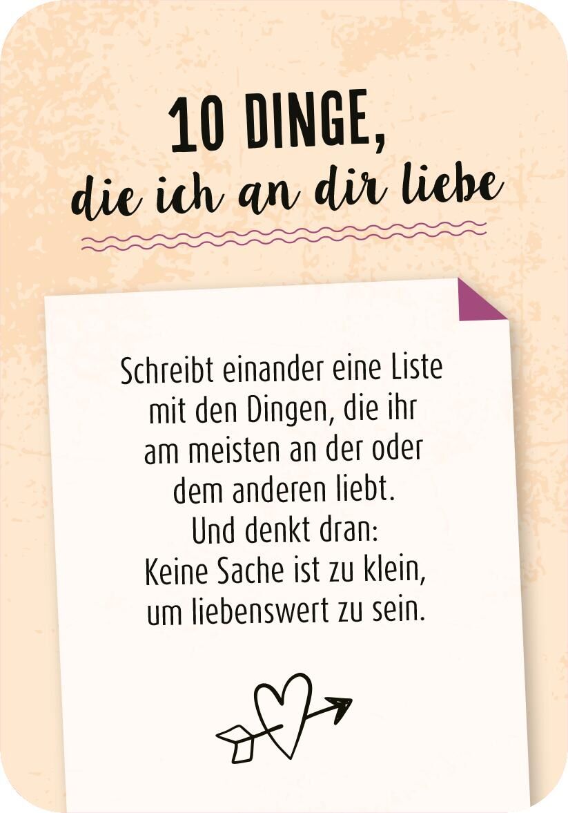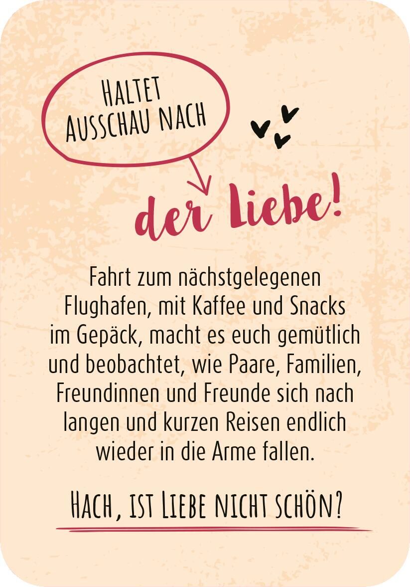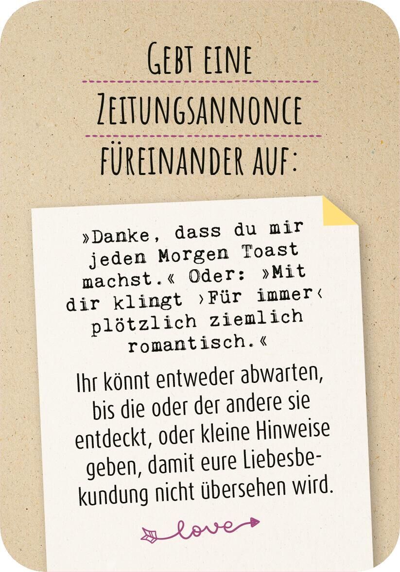 99 wundervolle Anregungen für ein bisschen mehr Herzklopfen im Beziehungsalltag Sternschnuppen zählen, romantische Küsse auf einem Riesenrad tauschen oder an einer Weinwanderung teilnehmen - diese Kartenbox schenkt 99 Ideen von romantisch bis herrlich verrück...