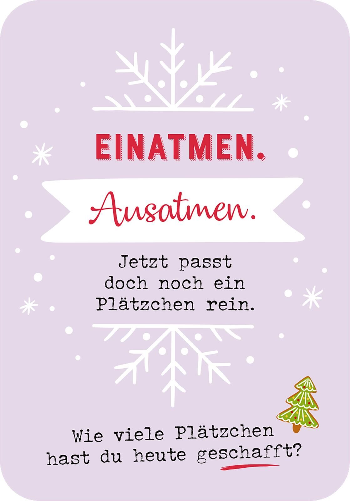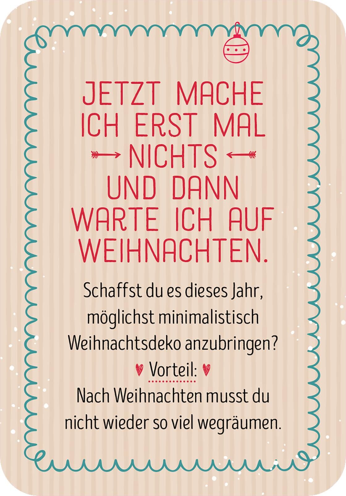 Witzige Ideen für eine entspannte Vorweihnachtszeit Dieser witzige Adventskalender im Taschenformat zeigt dir, wie du in der Weihnachtszeit unnötigen Stress vermeidest und von Tag zu Tag relaxter wirst! So kannst du dich auf das Wesentliche konzentrieren und ...