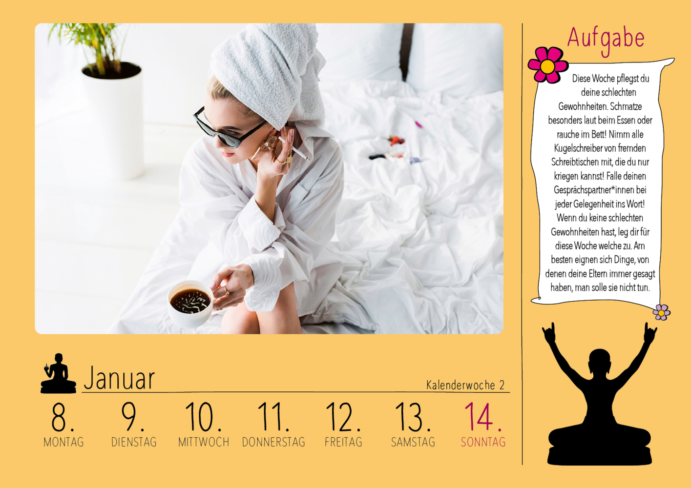 Mit dem Bestseller Am Arsch vorbei geht auch ein Weg räumte Erfolgsautorin Alexandra Reinwarth auf mit unrealistischen Vorsätzen, Energiedieben und dem ewig schlechten Gewissen wegen diesem oder jenem. Der dazu passende Wochenkalender bietet jedes Jahr origin...