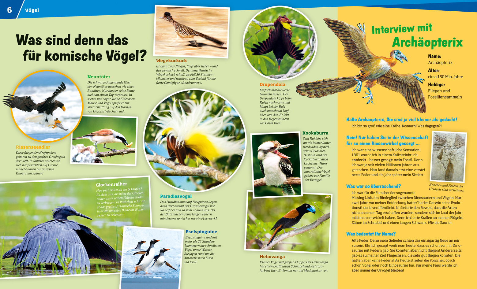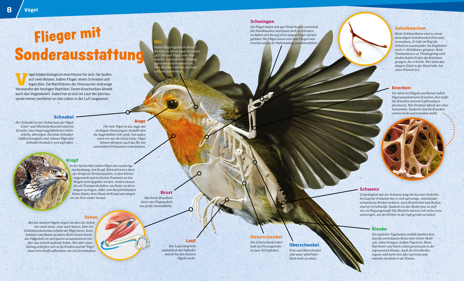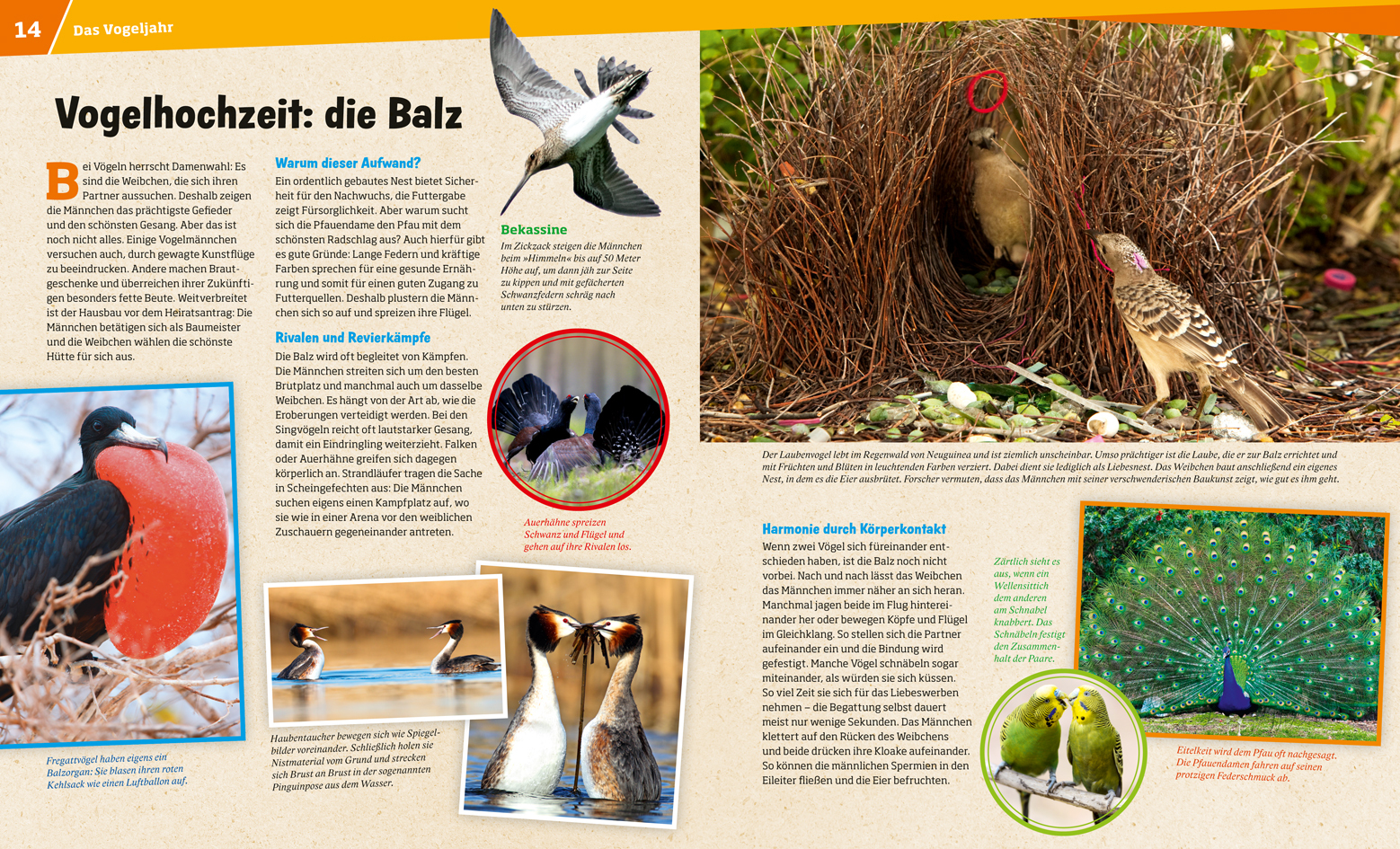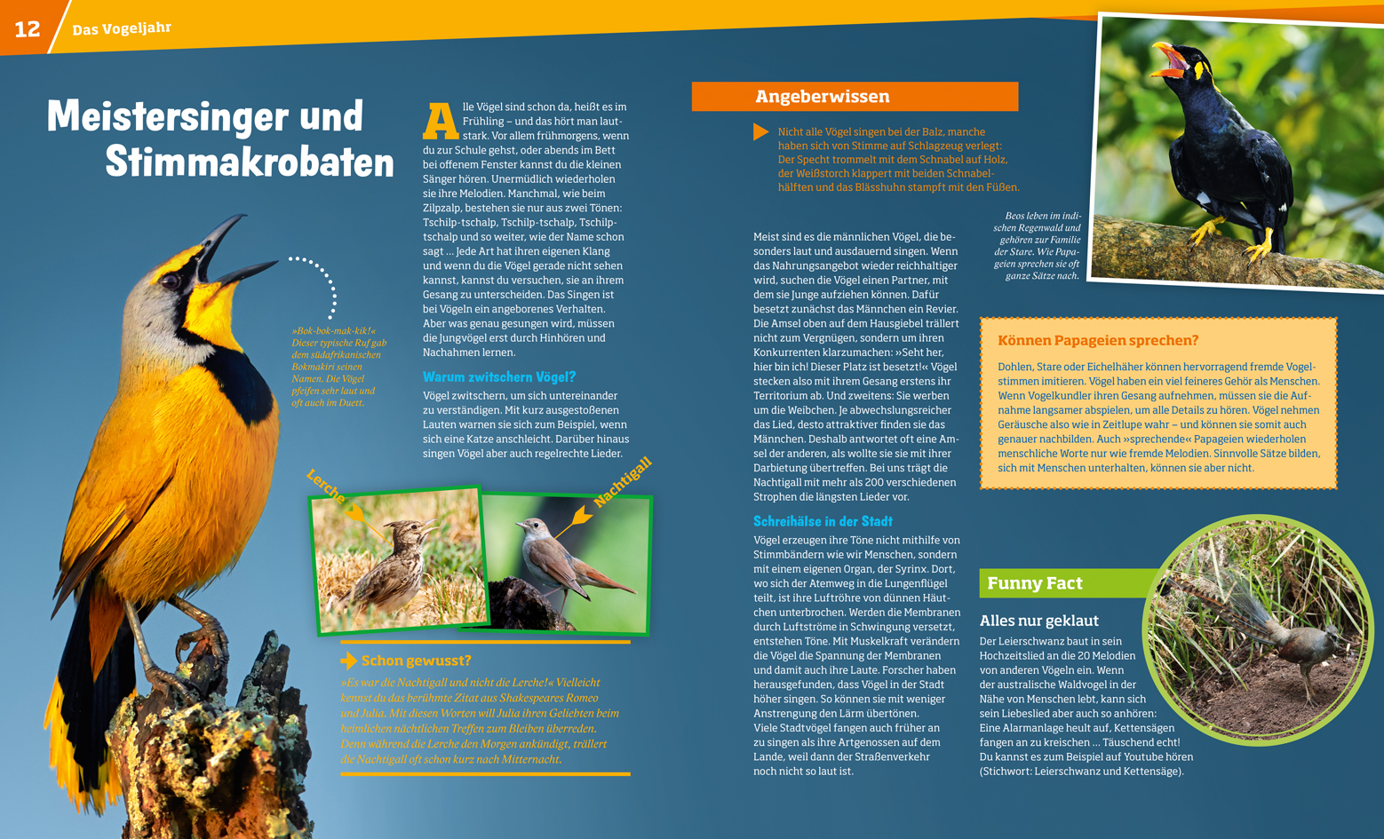 Alle Vögel sind schon da, heißt es im Frühling. Mit ihrem Gesang, ihrem Gezwitscher stecken sie ihr Territorium ab und werben um die Weibchen. Vögel sind auch Akrobaten der Lüfte! Kolibris können rückwärts fliegen, Aras nutzen ihren Schnabel als Kletterhilfe. ...