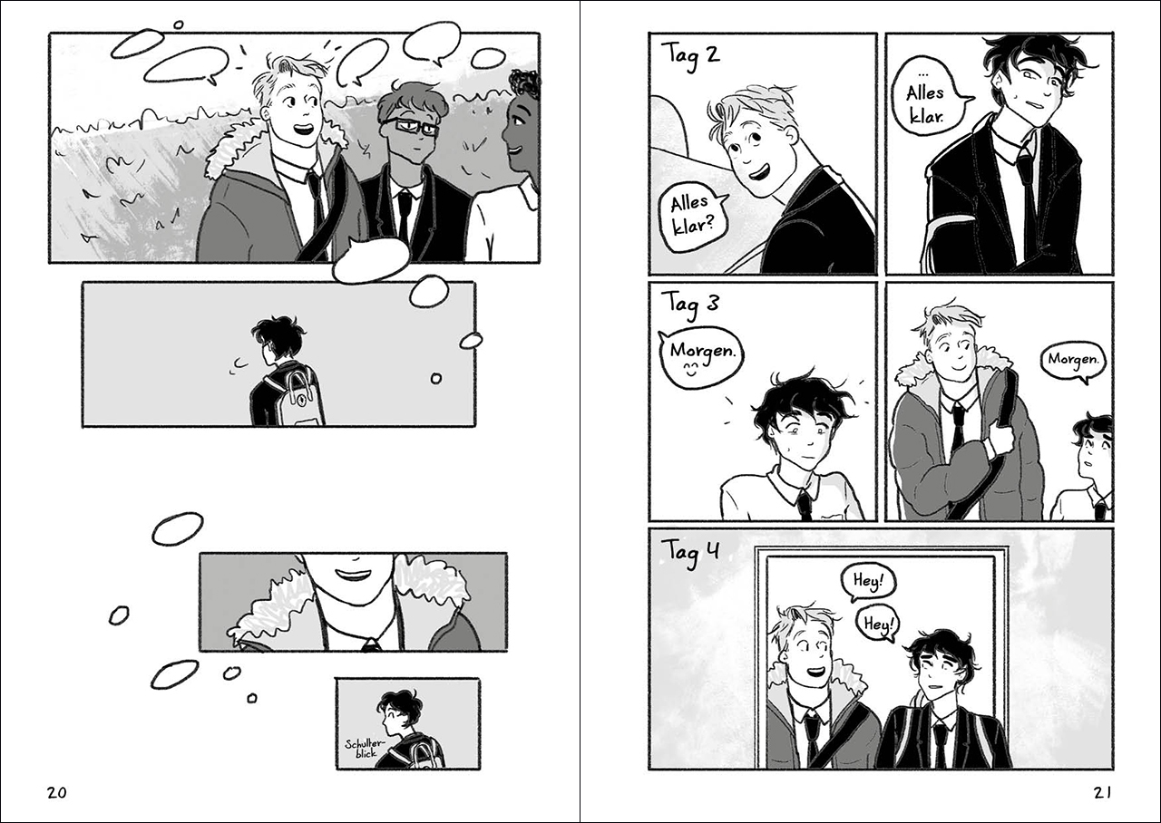 Mit einfach gezeichneten Bildern und wenig Text schildert Alice Oseman das vorsichtige Zueinanderfinden der beiden Jungen - nah dran an der Lebensrealität von Jugendlichen und ganz ohne Kitsch. boys & books Der Comic erzählt die Geschichte vom Kennenlernen der beiden Jungen bis zur ersten echten Annäherung langsam und unaufgeregt mit einfachen Zeichnungen und wenig Worten und zieht Leserinnen in den Bann. Eva Maus, eselsohr Oseman triftt einen Nerv der Zeit. Es braucht so schöne Geschichten wie die von Charlie und Nick, damit Diversität wirklich gelebt werden kann. Kim Kindermann, Deutschlandfunk Kultur Heartstopper' erzählt in schön gezeichneten Bildern eine Liebesgeschichte, bei der man nicht schnell genug weiterlesen kann. Die Charaktere sind liebevoll ausgearbeitet, man schließt Charlie und Nick sofort ins Herz und hofft mit ihnen, dass sie glücklich werden. Benita Droege, Aachener Nachrichten Heartstopper' ist eine fantastisch gezeichnete Feel-Good-Story. Eine der kleinen sympathischen Fluchten in eine Welt, der die reale meist noch etwas hinterherhinkt, und hat alles, was eine gute Liebesgeschichte ausmacht. Jürgen Reuß, Badische Zeitung Alice Oseman erzählt mit Heartstopper' die berührende Liebesgeschichte zweier Schüler. Einfühlsam und gleichzeitig ehrlich hat die Autorin damit eine Geschichte für Bücherfreunde ab zwölf Jahren geschrieben, die sich sonst in vielen Büchern nicht repräsentiert fühlen. Badisches Tagblatt Die Künstlerin hat einen sehr schönen Artstyle und einen Weg, die Charaktere zum Leben zu erwecken. Ich mochte an dem Buch sehr gerne, dass die Romanze sehr natürlich kam: die ganzen Charaktere wirkten echt und lebendig. WDR 2 High-Chool-Movie meets Jugendroman: In dieser Graphic Novel vereinen sich Bild und Text einfach perfekt. MOKA Eine queere Geschichte über das Leben, die Liebe und alles dazwischen. Queer Alice Oseman greift verschiedene Themen rund um die erste Liebe, das Erwachsenwerden, Freundschaft und LGBTIQ auf und verpackt sie in einem tollen Comic. Känguru plus Eine wunderschöne Liebesgeschichte, die authentisch ist und von ihren Charakteren lebt. Jugendbuch Couch Ich wollte immer weiter blättern und konnte meinen Blick doch kaum von den Bildern lenken, aus Angst wichtige Details zu verpassen. Hertzklecks ,Heartstopper' ist viel mehr als nur eine süße Boy-meets-Boy-Liebesgeschichte. Mit Fingerspitzengefühl verwebt Alice Oseman Identitätszweifel, verzwickte Beziehungen und die Folgen von Mobbing mit der typischeren Tennie-Love-Story. Get booked with Nancy Das offensichtliche Thema der Sexualität wird durch Alice Oseman auf tolle Art und Weise verarbeitet und ein offener Umgang gefördert, ganz ohne, dass es zu aufdringlich wird, denn auch Themen wie Freundschaft, Liebe, Identitätsfindung und Konflikte finden Einzug in die Graphic Novel. Piglet and her Books Alice Oseman erzählt mit Fingerspitzengefühl und ohne die Schwierigkeiten zu beschönigen durch welche Hochs und Tiefs Charlie geht und schafft es dabei die Leser mit auf die emotionale Achterbahn zu nehmen. Claudis Gedankenwelt Heartstopper ist eine lebensnahe, warme und liebenswerte Liebesgeschichte, in der sich wohl jeder in dieser Altersklasse wiederfindet, egal ob er schwul, lesbisch, hetero, bi oder was auch immer ist. Cup of Tea Book Ich hatte beim Lesen oft ein Lächeln im Gesicht, weil mich die Geschichte einfach so glücklich gemacht hat und man sich auch mit den Charakteren gut identifizieren konnte. Eli`s Bücherecke Ein berührender und authentischer Einstieg in eine wundervoll anmutende Liebesgeschichte. Charlie und Nick werden gewiss noch einige emotionale Bände für uns bereithalten. Sophias Bookplanet Mit viel Liebe und Einfühlungsvermögen erzählt Alice Oseman die Geschichte der beiden und behandelt dabei große Themen wie Sexualität, Mobbing, Freundschaft und die erste große Liebe. Für mich eine absolute Herzensempfehlung! Lila Blumenwiese Osemans Storytelling ist einfühlsam, schreckt aber auch nicht vor härteren Wahrheiten zurück. ,Heartstopper' ist einfach ein absolut perfektes Gesamtpaket, das ich jedem ans Herz legen würde! Bookish Blades Heartstopper' ist eine klassische Coming-of-Age-Geschichte, die insgesamt zuckersüß und romantisch daherkommt, ohne kitschig oder übertrieben zu wirken. Stattdessen ist sie lebensnah und authentisch. Like a Dream Heartstopper' ist ein Wohlfühlbuch mit einer Geschichte ohne großes Drama. Mein Highlight war aber der Zeichen- bzw. Erzählstil. Große Empfehlung! Throughsioux Alice Oseman lässt uns mit ausdrucksstarken Bildern die erste Verliebtheit, aber auch andere Schulthemen wie Mobbing und Akzeptanz in all ihren Höhen und Tiefen miterleben. Stiftung Lesen Verliebe dich mit Charlie zum ersten Mal, finde dich mit Nick selbst und lerne, für dich selbst einzustehen entgegen allen Widrigkeiten. Jugendjury Lesekompass 2023, Mein Samstag Der Jugendjury gefiel vor allem der behutsame Umgang mit dem Thema Homosexualität und die tiefgründige Gestaltung der Figuren. Mein Samstag