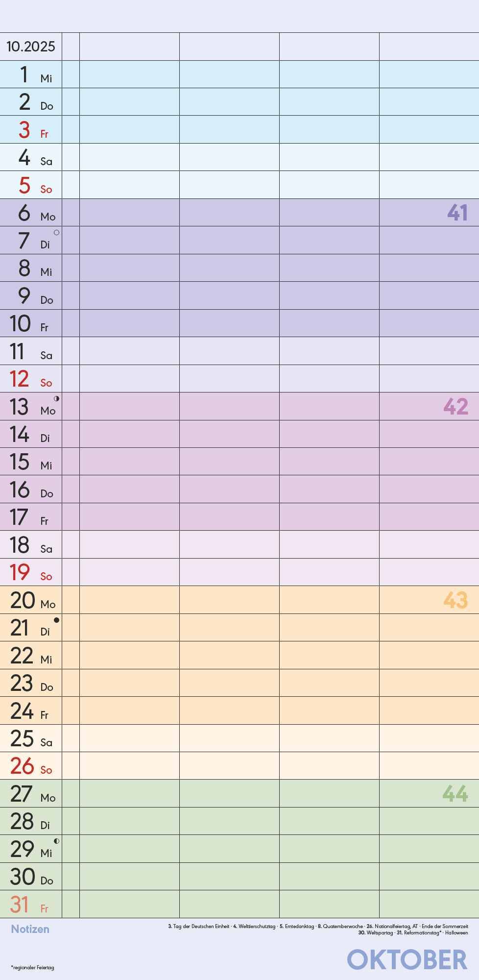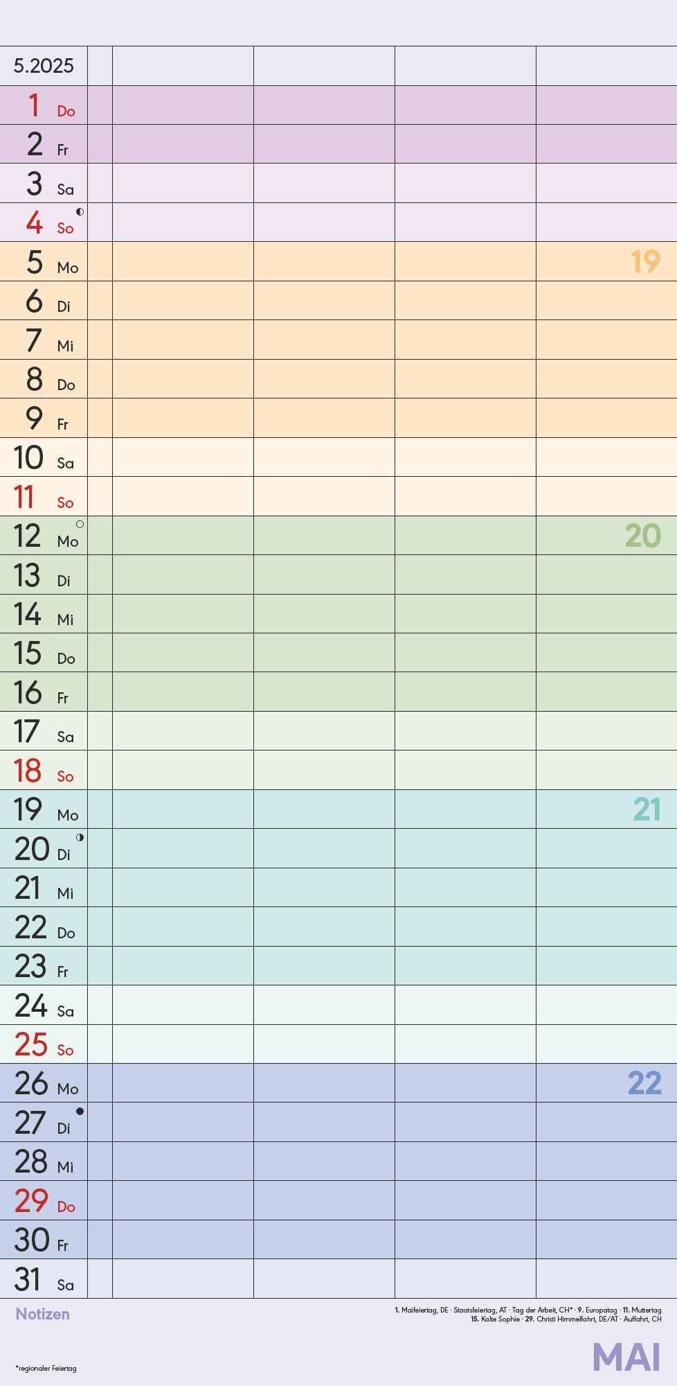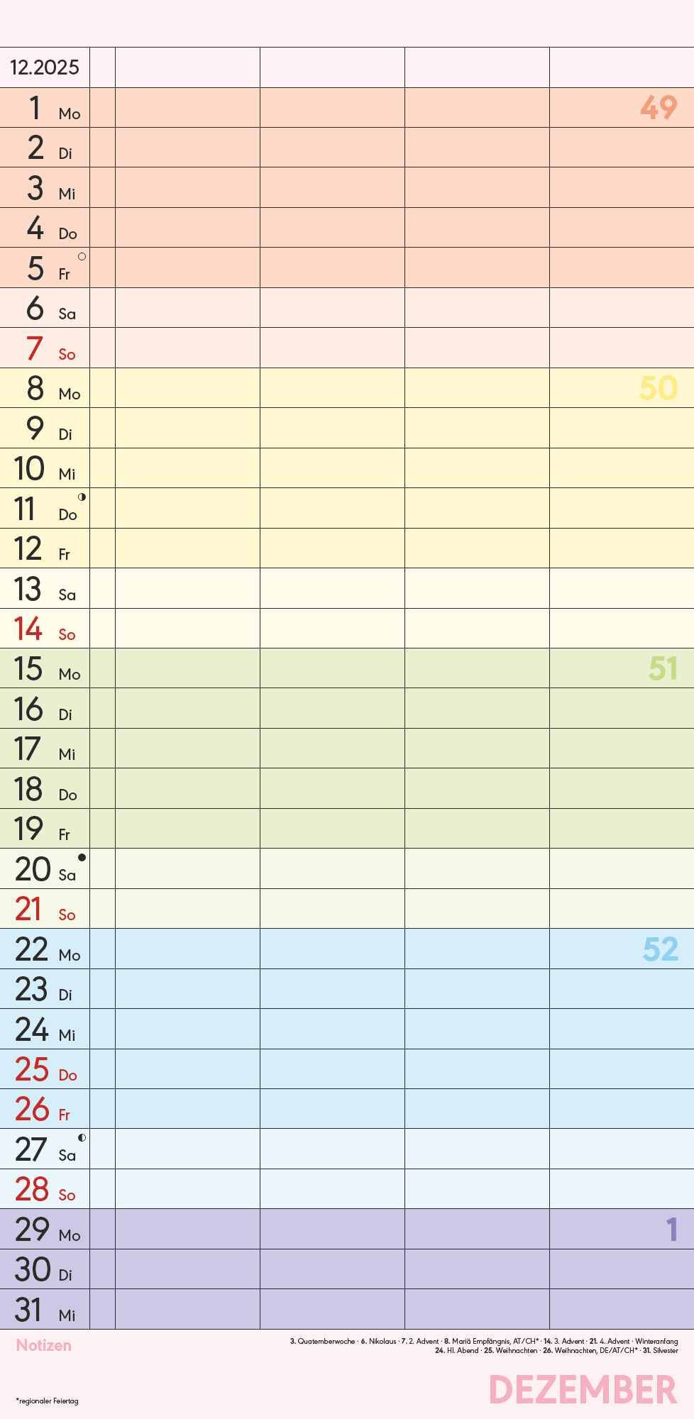 Gedruckt auf hochwertigem Offset-Papier für eine ideale Beschreibbarkeit der KalenderseitenHergestellt in DeutschlandFSC-zertifiziertDeutschsprachiges KalendariumFeiertage (DE/AT/CH/FR/IT)4 Spalten für übersichtliches Eintragen von TerminenZusätzlicher Notizbe...