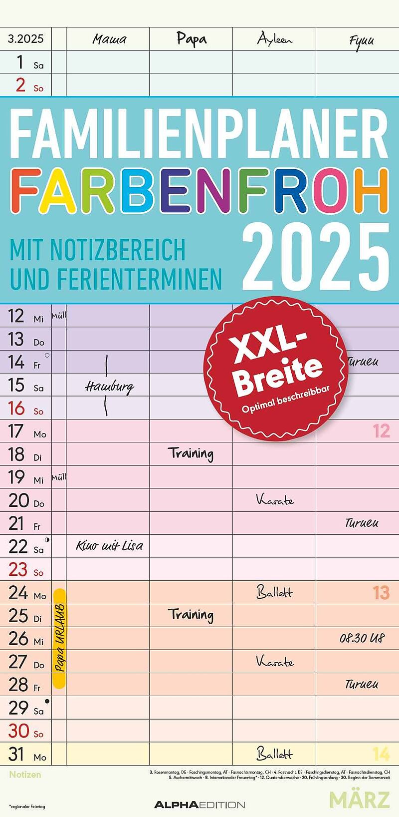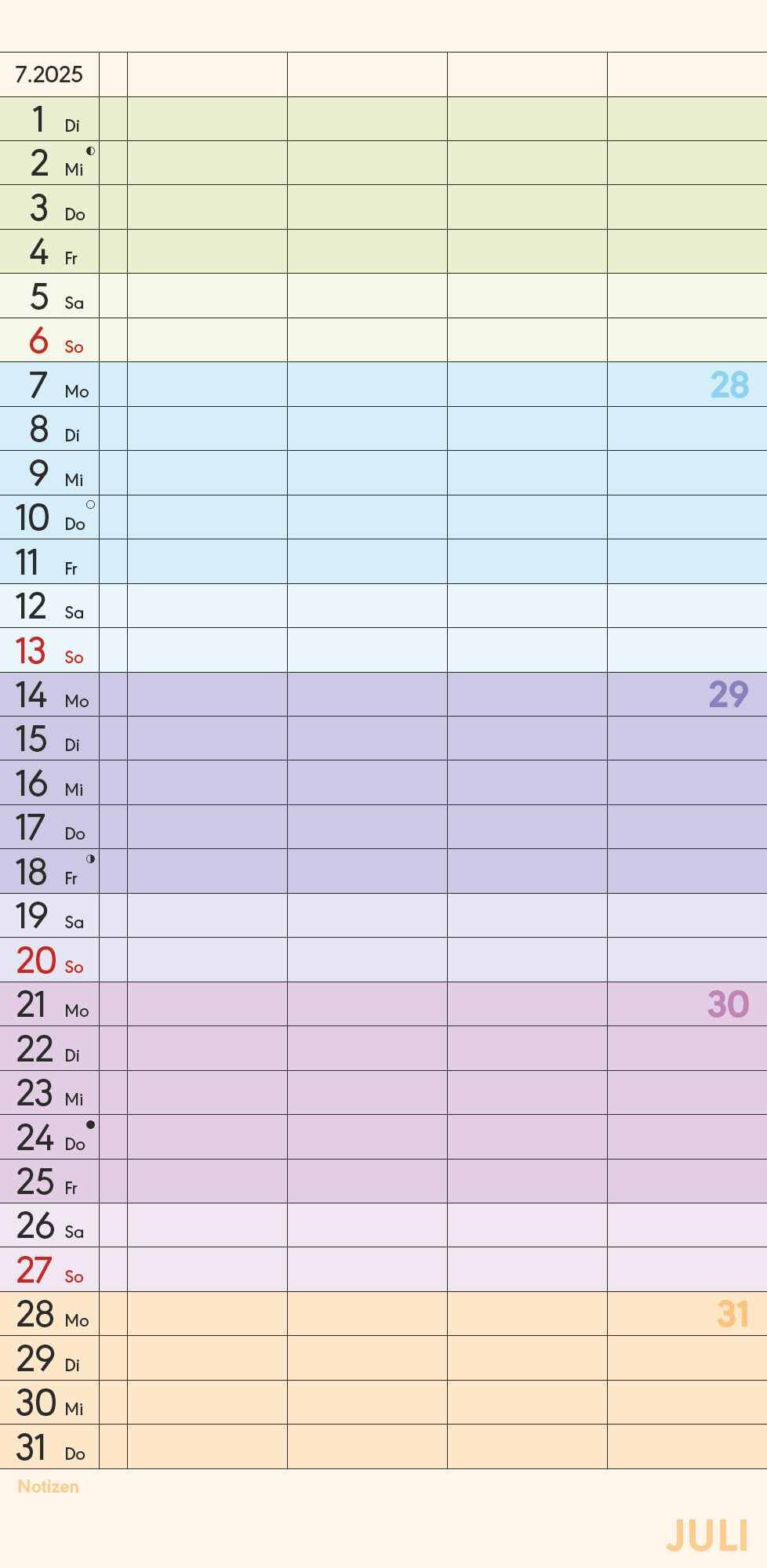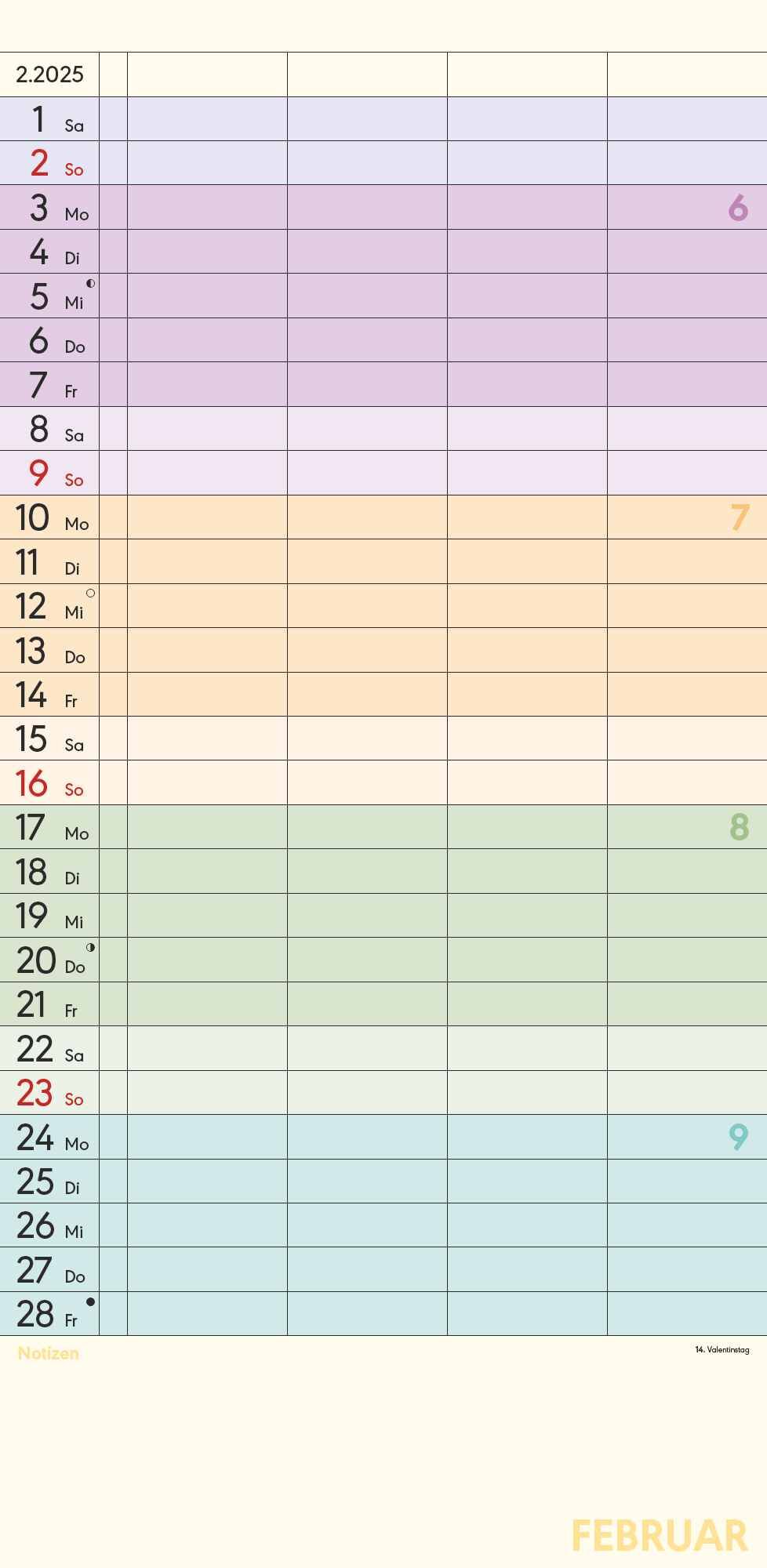 Gedruckt auf hochwertigem Offset-Papier für eine ideale Beschreibbarkeit der KalenderseitenHergestellt in DeutschlandFSC-zertifiziertDeutschsprachiges KalendariumFeiertage (DE/AT/CH/FR/IT)4 Spalten für übersichtliches Eintragen von TerminenZusätzlicher Notizbe...