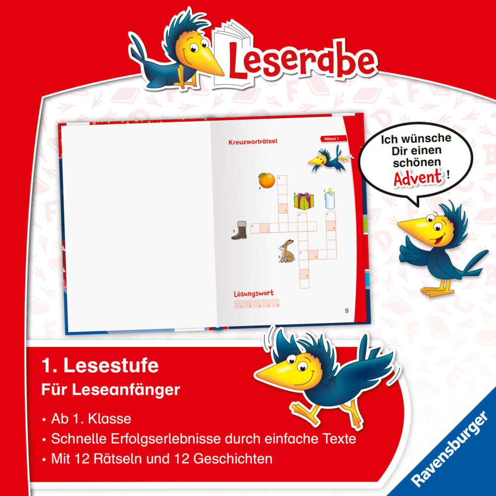Zwölf weihnachtliche Geschichten, begleitet von zwölf Leseraben-Rätseln. Hanna wünscht sich einen echten Tiger zu Weihnachten, Lara trifft ihre Freundin die Elfe im winterlichen Wald, Eva und Jonas suchen nachdem Schokoladendieb, Max hilft dem Nikolaus, die Schneeprinzessin rettet einen Schneehasen und Lara und Paul bringen weihnachtliche Stimmung in den Umzugsstress. Außerdem bauen Tom, Anna und Lilo ein Iglu, Marie verliert beim Backen ihren Ring, Moritz träumt vom Fliegen, Julian verlegt sein geheimes Weihnachtsgeschenk, Lukas und Lea suchen einen Stern für die Weihnachtsbaumspitze und der Weihnachtshase bekommt Hilfe von Emma und Moritz.