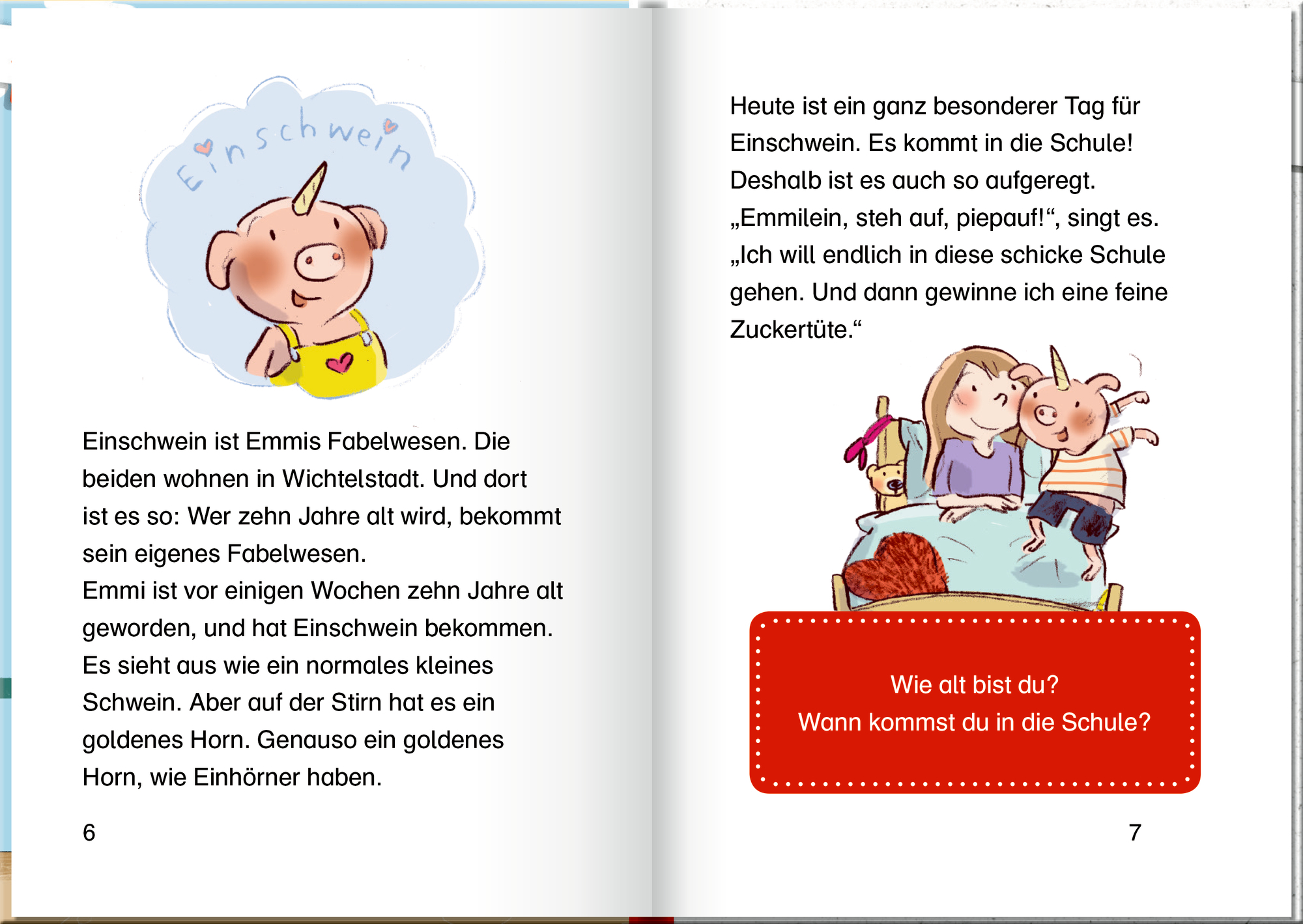 An seinem ersten Schultag ist Einschwein mächtig aufgeregt, und es nimmt sich vor, alles fein und richtig zu machen. Aber als das Schwein lauter lustige Dinge in seine Schulmappe packt, ahnt Emmi bereits, dass dieser Tag turbulent wird. Sie schärft ihrem Fabe...