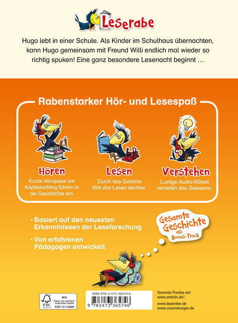 Hugo lebt in einer Schule. Als Kinder im Schulhaus übernachten, kann Hugo gemeinsam mit Freund Willi endlich mal wieder so richtig spuken! Eine ganz besondere Lesenacht beginnt ... Hören, lesen, verstehen: Das neue Leseraben-Konzept verbindet Hörbuch und Erstl...