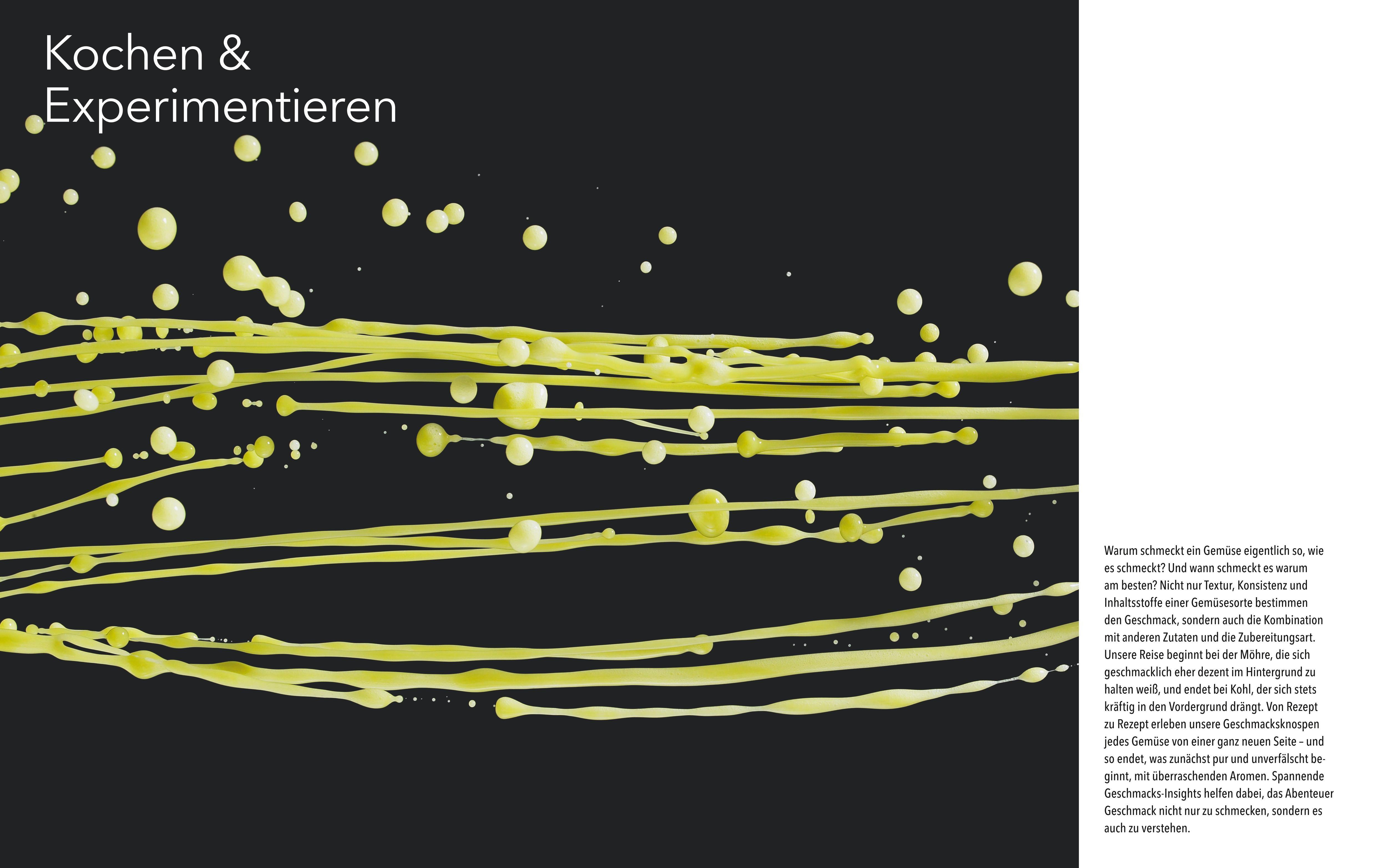 Am Anfang steht ein einzelnes Gemüse, zum Beispiel Möhren, Erbsen oder Kürbis. Ein Geschmacksporträt klärt auf welche Aromen können wir in der Karotte finden ? Wie können wir sie süß, roh, gedünstet und als komplettes Gemüse erfahren? Die Aufschlüsselung der genauen Aromastoffe zeigt, was sich alles in der Erdwurzel befindet und welche Gewürze und Öl sowie Zubereitungsarten wir anwenden können, um ihren unverwechselbaren Geschmack herauszukitzeln. Es gibt Indian Carrot Halwa , Vichy Möhren mit Hähnchenbrust und Ofenmöhren mit Gremolata und Möhrengrün-Öl. Jedes Gemüse wird begleitet von vier Rezepten, in denen man alle Nuancen erkennen kann.