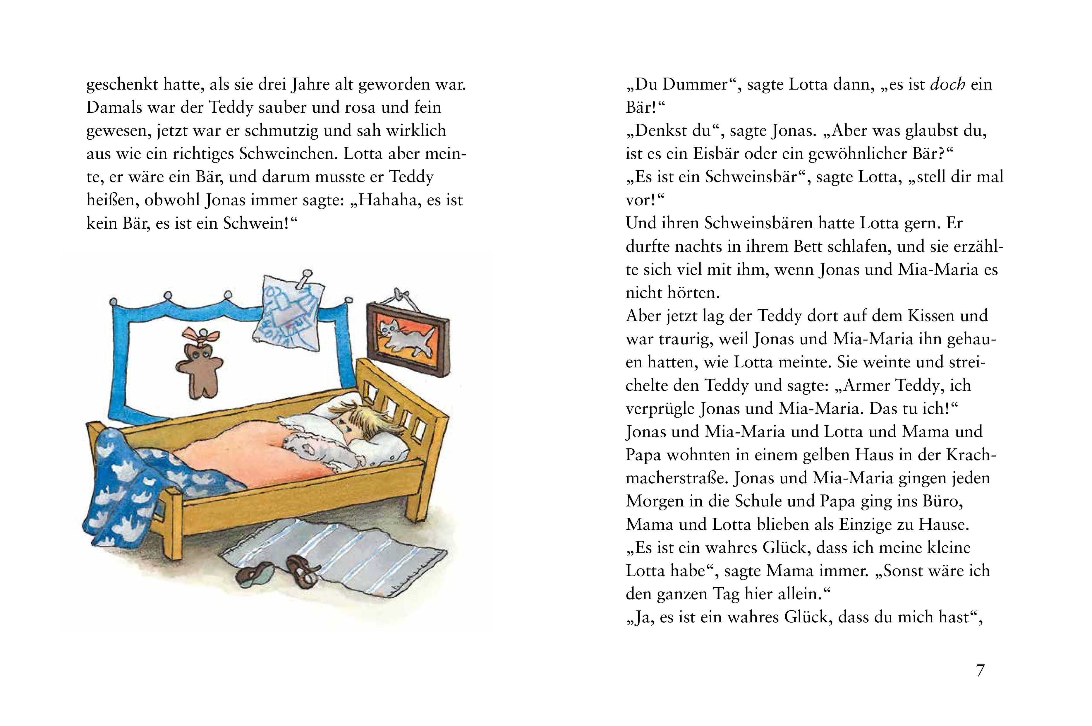 Als Lotta aus der Krachmacherstraße eines Morgens den kratzigen Pullover von ihrer Oma anziehen soll, wird sie richtig wütend. Erst schneidet sie ein großes Loch in den Pullover und dann beschließt sie kurzerhand zu Hause auszuziehen. Nicht weit, nur zu Tante...