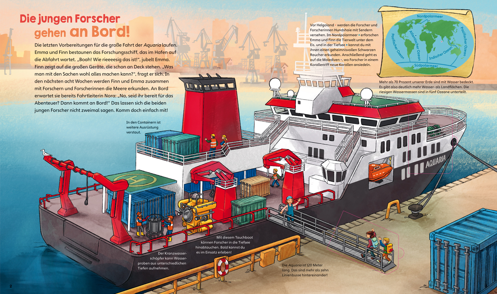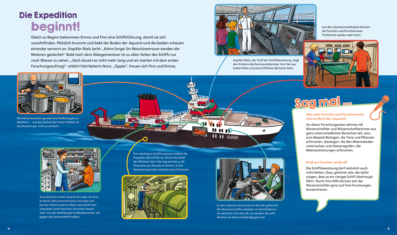 Ganz schön was los im Meer! Was genau? Das erforschen Finn und Emma an Bord des Forschungsschiffes Aquaria. Von Bremerhaven aus geht es in die Nordsee, ins Polarmeer, in den Atlantik und den Indischen Ozean. Überall gibt es wichtige Forschungsarbeit zu leisten...