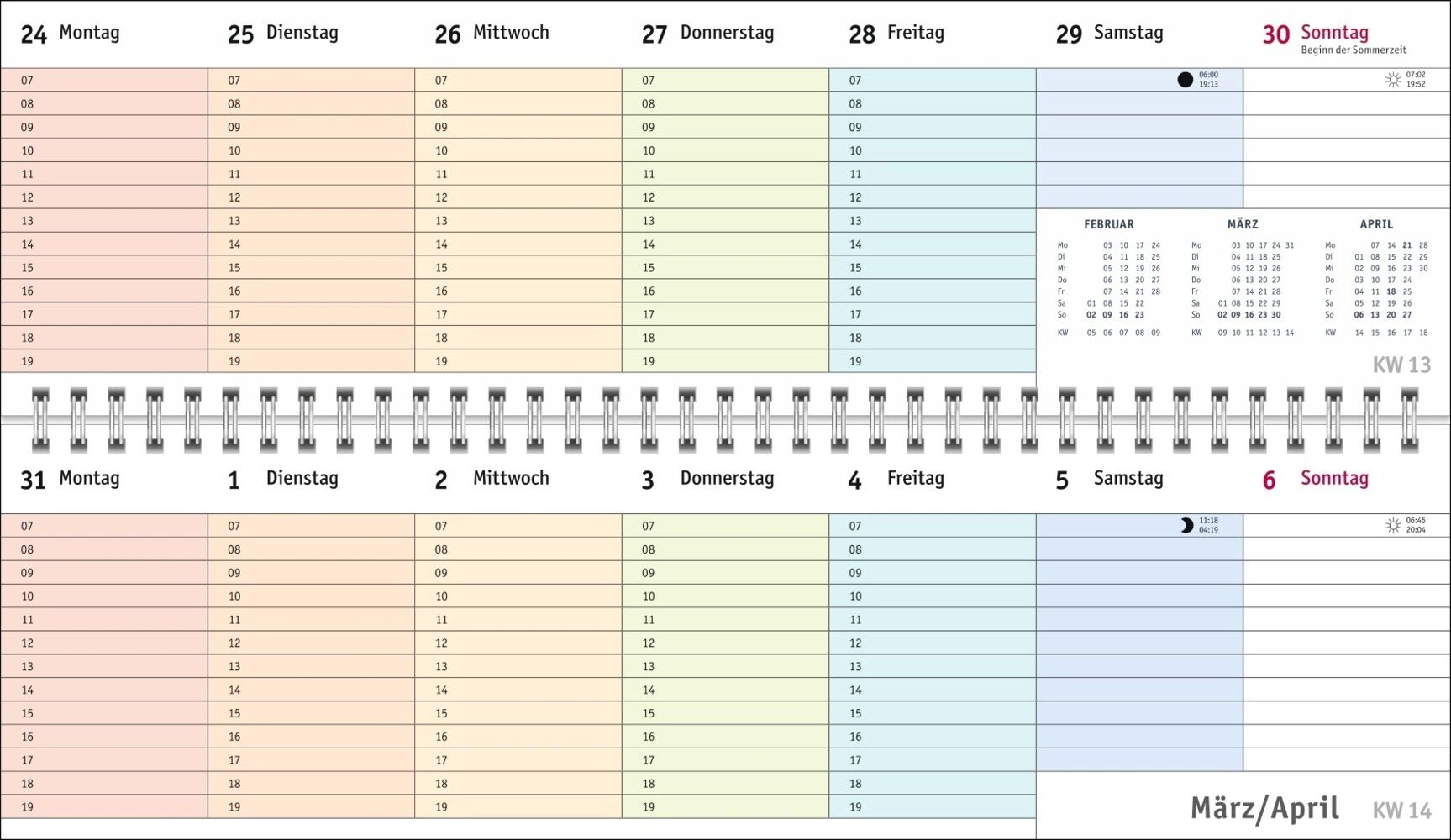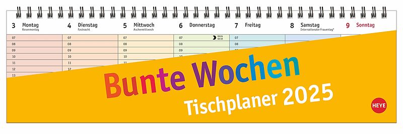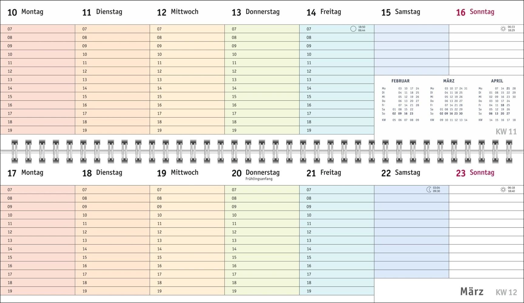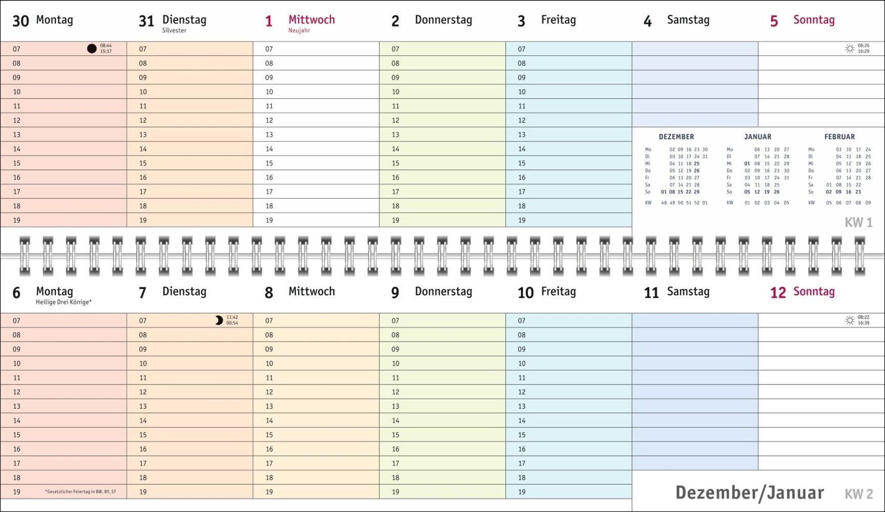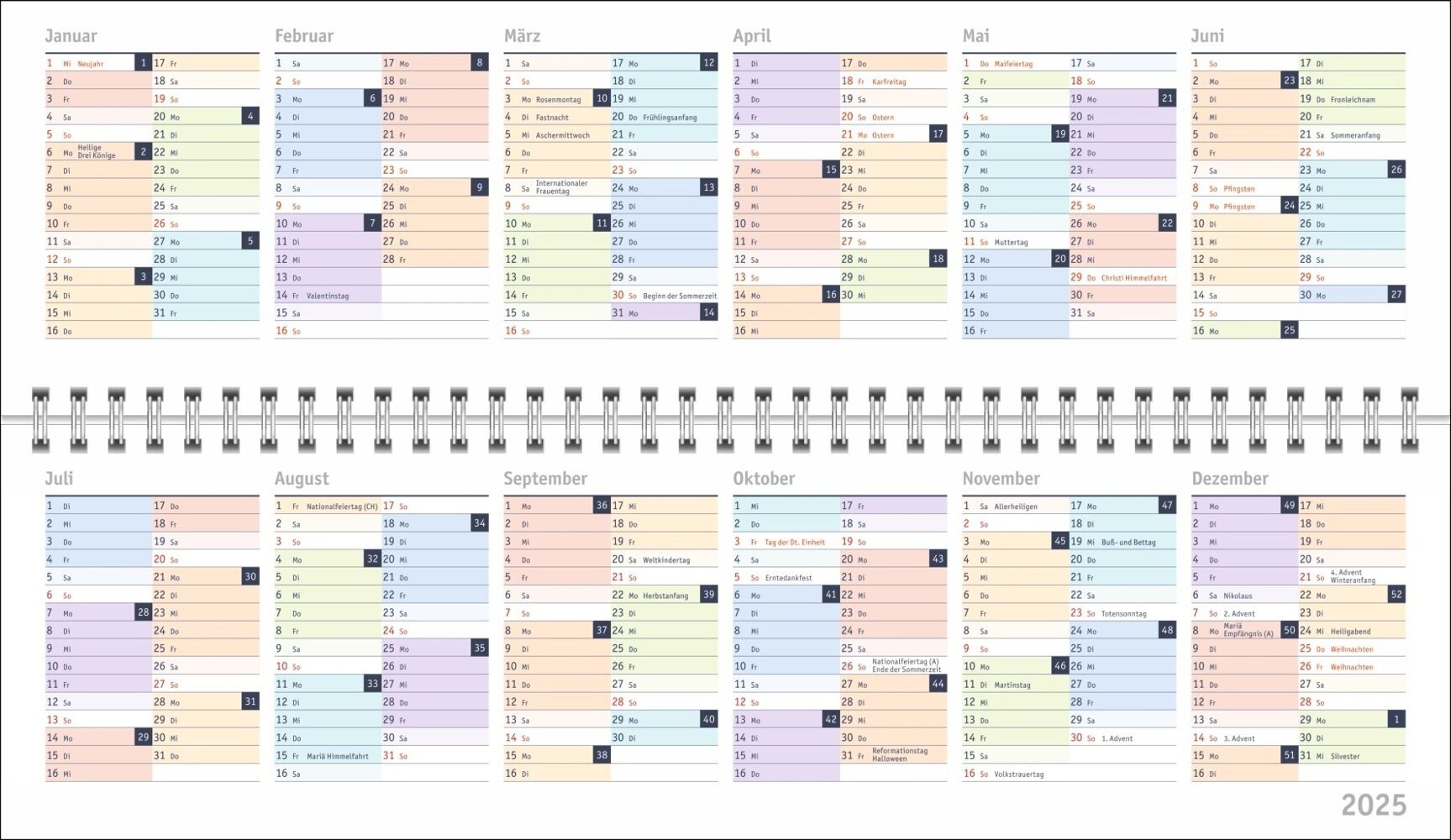 Klassischer und praktischer Tischquerplaner in schönem bunten Design mit viel Platz zum Eintragen - für Termine, Notizen, Wichtiges, Ideen und To-dos. Jeder Tag in einer anderen Farbe, so verrutscht garantiert kein Termin mehr! Mit Jahresübersichten 2025 und 2...