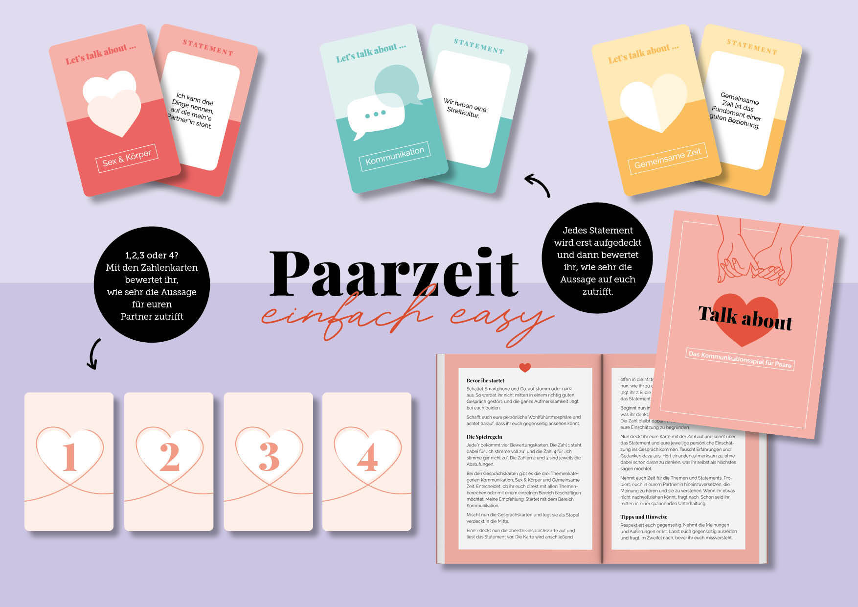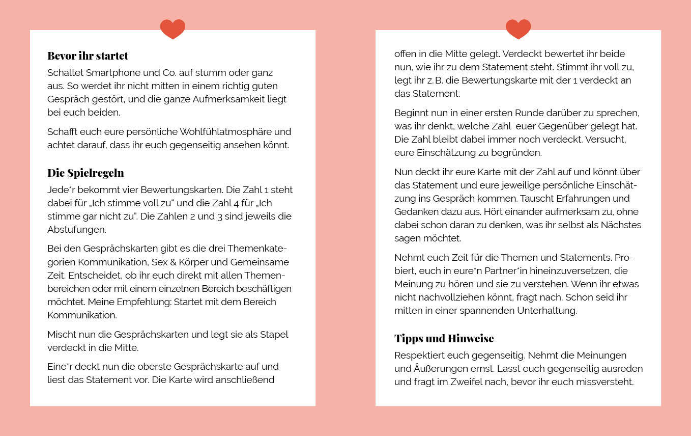 Deep Talk statt Small Talk ist bei dieser Kartenbox angesagt. Der erfahrene Paar- und Sexualtherapeut Carsten Müller hat für den Alltag von Paaren ein Kartenspiel entwickelt, das Spaß, Tiefgang und bestimmt die ein oder andere Überraschung für Frischverliebte...