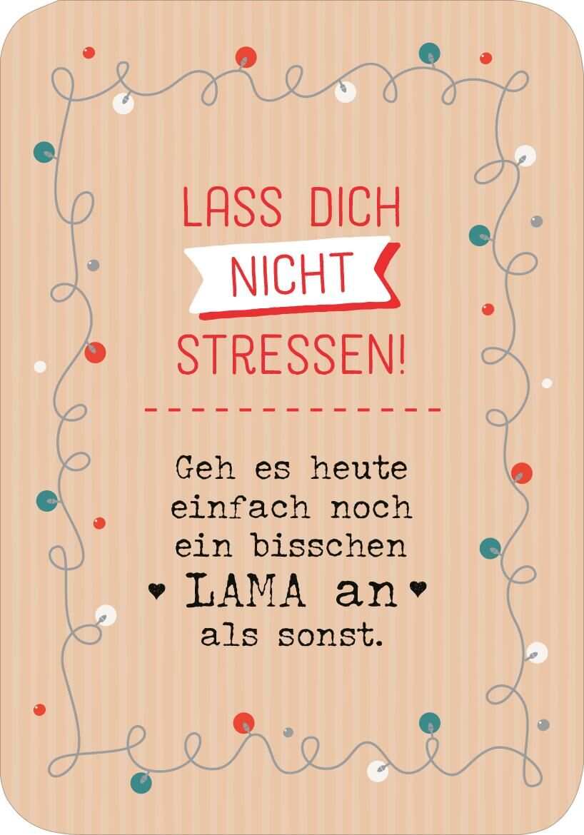 Witzige Ideen für eine entspannte Vorweihnachtszeit: Lama statt Drama! Dieser witzige Adventskalender im Taschenformat zeigt dir, wie du in der Weihnachtszeit unnötigen Stress vermeidest und von Tag zu Tag relaxter wirst! So kannst du dich auf das Wesentliche...