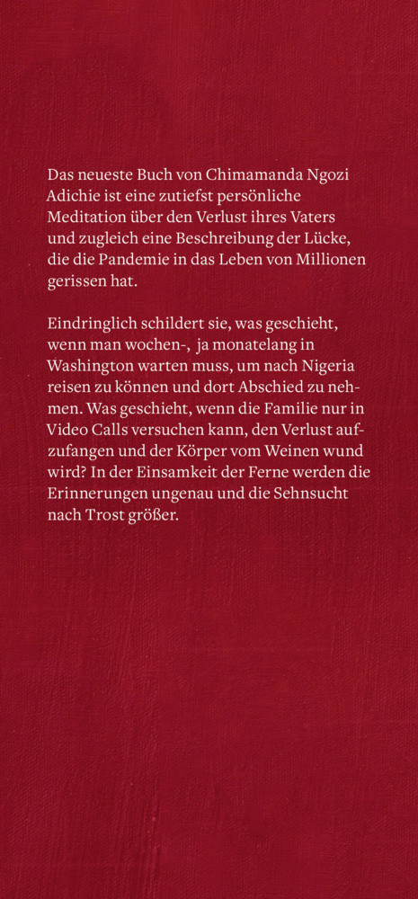 Eine der größten Autorinnen der Weltliteratur schreibt ein intimes Buch über den Tod ihres Vaters Chimamanda Ngozi Adichie schreibt zutiefst persönlich über den Verlust ihres Vaters und zugleich eine Beschreibung der Lücke, die die Pandemie in das Leben von M...