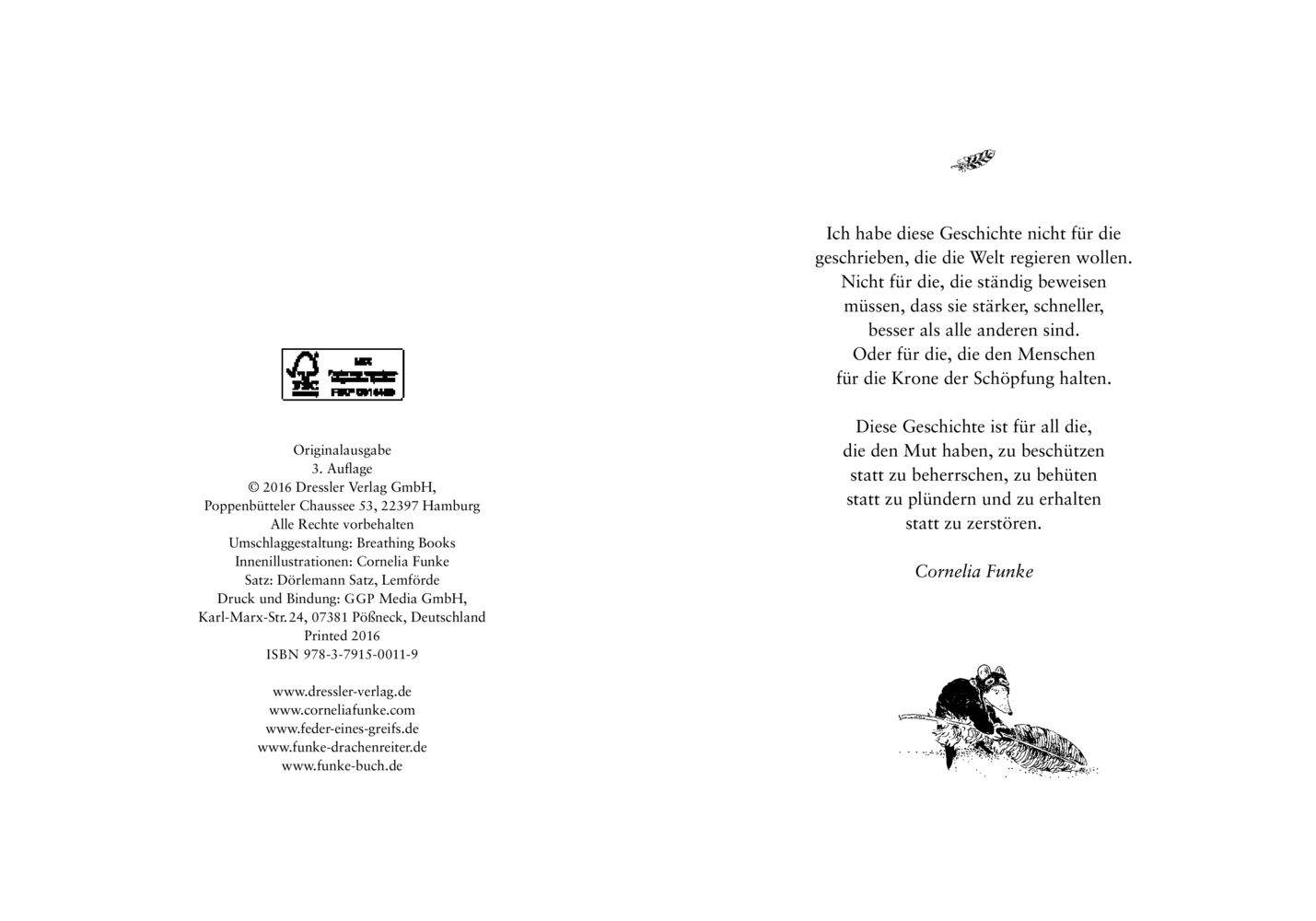 Funke webt geschickt eine Geschichte, die nicht nur durch ihre phantastischen Elemente und atmosphärischen Beschreibungen fasziniert, sondern auch tiefgründige Themen wie Mut, Freundschaft und den Schutz bedrohter Arten berührt. Ihre Fähigkeit, eine Welt zu erschaffen, in der die Grenzen zwischen Realität und Fantasie verschwimmen, macht "Die Feder eines Greifs" zu einem unvergesslichen Leseerlebnis. Das Buch ist eine gelungene Fortsetzung, die alte und neue Fans gleichermaßen begeistert und zeigt, dass Cornelia Funke auch zwanzig Jahre nach dem ersten Band nichts von ihrer Erzählkunst eingebüßt hat. Die vielschichtigen Charaktere, die sowohl Stärken als auch Schwächen zeigen dürfen, verleihen der Geschichte eine besondere Tiefe und machen sie zu einem Plädoyer für Toleranz und den Schutz der Natur.