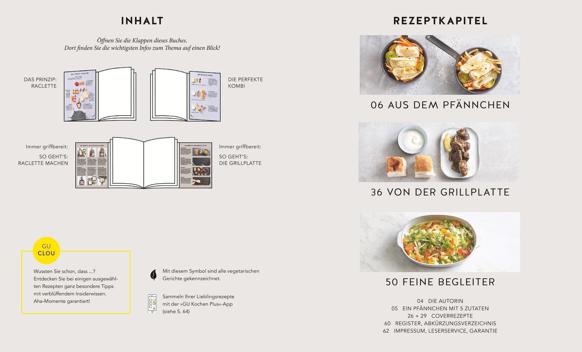 Sie gerne mehr über die besten Käsesorten fürs Raclette erfahren und Rezepte für feine Begleiter wie Salate und Dips ausprobieren wollen.Überraschende Rezepte für das schönste Gäste-Essen Viele Leute kennen das klassische Raclette von Silvester oder anderen Partys, wenn sich alle gemütlich um den Esstisch versammeln und gemeinsam brutzeln. Die bunten Zutaten stehen auf dem Tisch und können nach Herzenslust kombiniert werden. Neue fantasievolle Rezepte für das Kultessen finden Sie im GU Küchenratgeber Raclette. Das Kochbuch bietet eine Bandbreite an Rezepten, die durchaus von den Klassikern abweichen und die man das ganze Jahr genießen kann. Ob vegetarisch, vegan, mit Fleisch oder Fisch, für jeden ist etwas dabei. Da kann nichts mehr schief gehen und Sie eröffnen Ihren Gästen einen neuen Horizont am Raclette-Himmel. Lecker brutzeln im Pfännchen und auf dem heißen Stein Der GU Küchenratgeber zeigt Ihnen einfach zuzubereitende und dennoch raffinierte Rezepte für das Pfännchen und die Grillplatte. Ob Grünkohl-Apfel-Pfännchen, Lammfilet mit Feta, Kartoffel-Tapas oder Fisch mit Knusperhaube - jeder kommt auf seinen Geschmack. Wenn Sie gerne die Grillplatte verwenden, gibt es auch dafür zahlreiche Rezepte wie etwa Bier-Hähnchen oder Lachs-Champignon-Spieße mit Ingwerbutter. Und auch Beilagen und Dips kommen nicht zu kurz: Orangen-Fenchel-Salat, Feldsalat mit Granatapfel oder Gurken-Ananas-Tatar ergänzen die bunte Raclette-Tafel. Bei ausgewählten Rezepten bietet der »GU-Clou« mit Insiderwissen einen verblüffenden Aha-Moment. Lassen Sie sich überraschen!