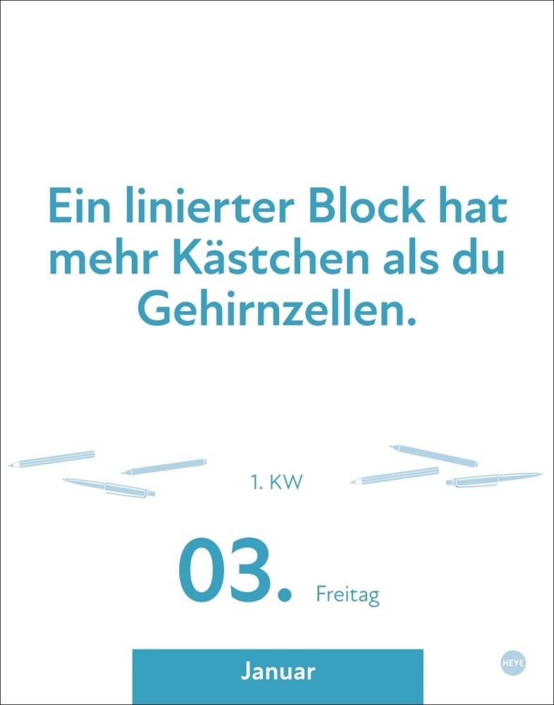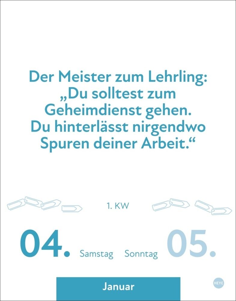 So hat man im Büro-Alltag jeden Tag was zu lachen: Der Tagesabreißkalender Bürosprüche sorgt für Humor und Witz an jedem Abeitsplatz und auf jedem Schreibtisch. Jeder Wochentag ein Kalenderblatt, Samstag/Sonntag auf einem Blatt.