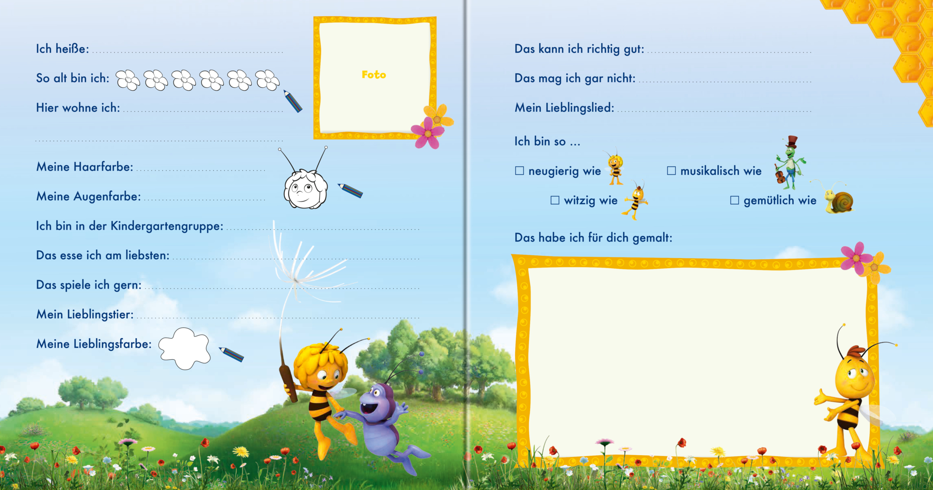 Hier finden alle Kindergartenfreunde und kleinen Fans der Biene Maja ihren Lieblingsplatz. Auf je einer Doppelseite können sie einfache Fragen beantworten, ihre Augen- und Haarfarbe malen und sich mit einem kleinen Kunstwerk verewigen. Zudem gibt es reichlich ...