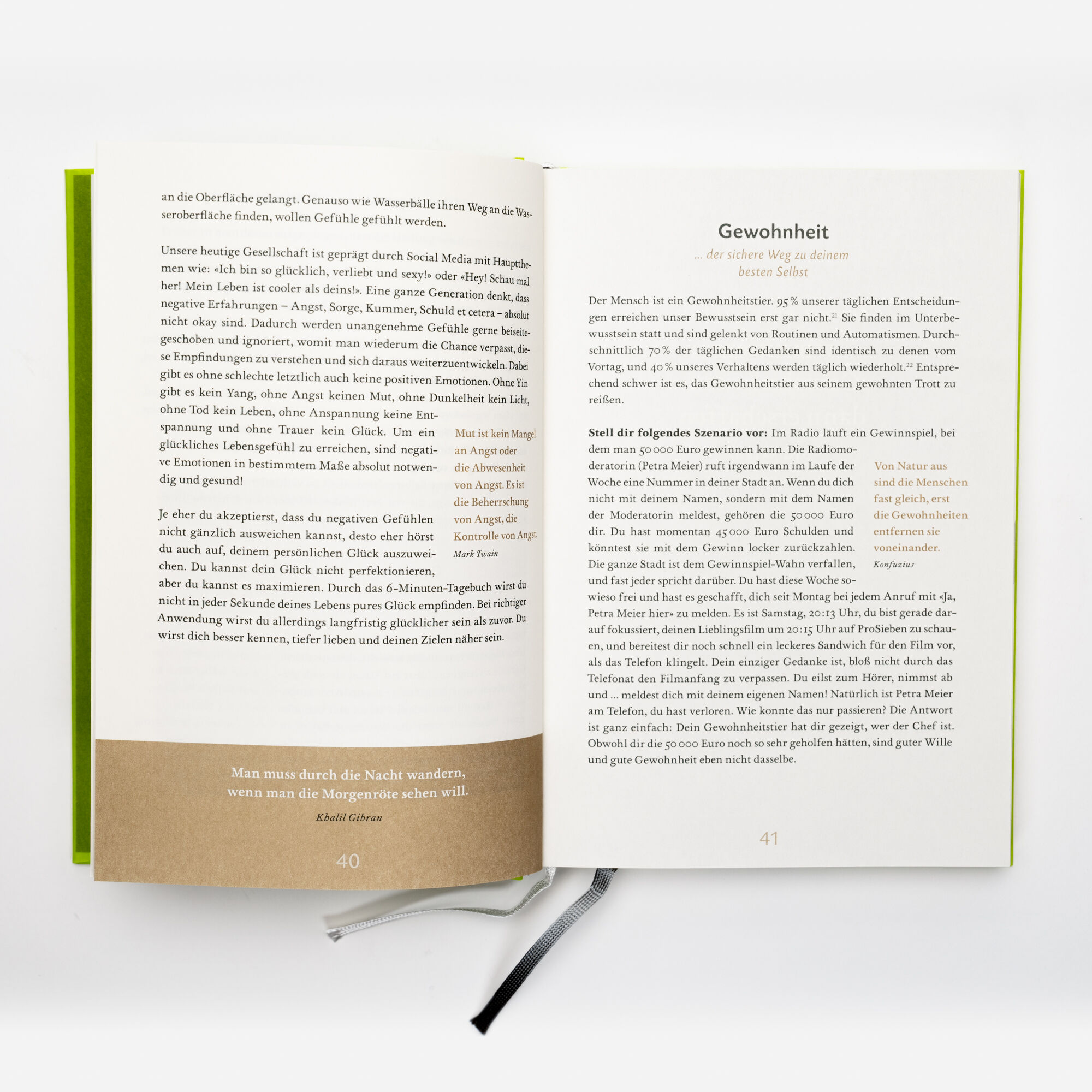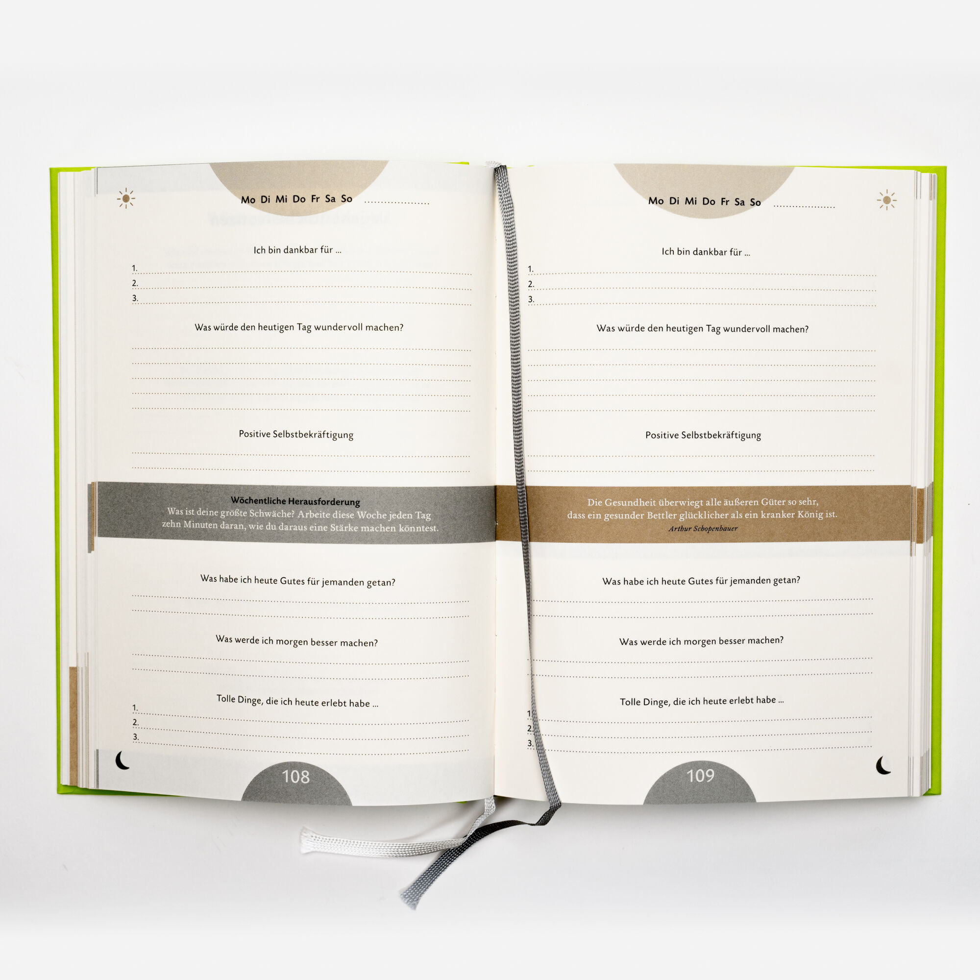 Wer ein gutes Leben will, braucht gute Gedanken - und die werden mit dem 6-Minuten-Tagebuch trainiert. Anstatt auf das zu schauen, was fehlt oder nicht passt, liegt hier der Fokus auf Fortschritt und das Gute. In jeweils 3 Minuten am Morgen und am Abend werde...