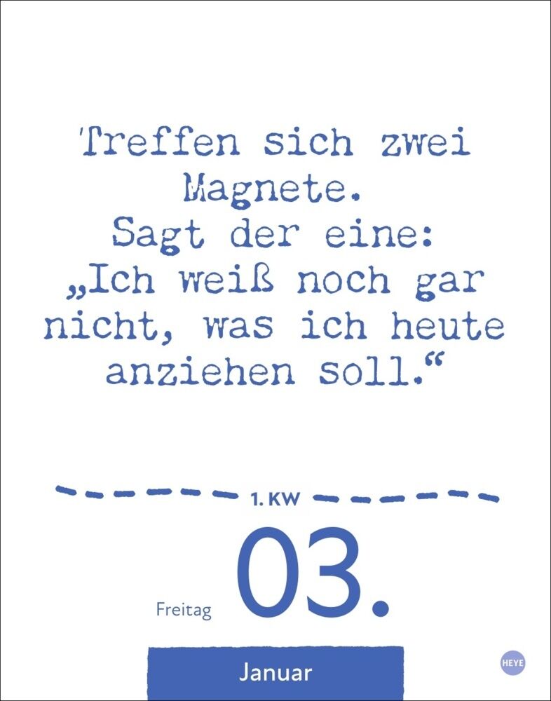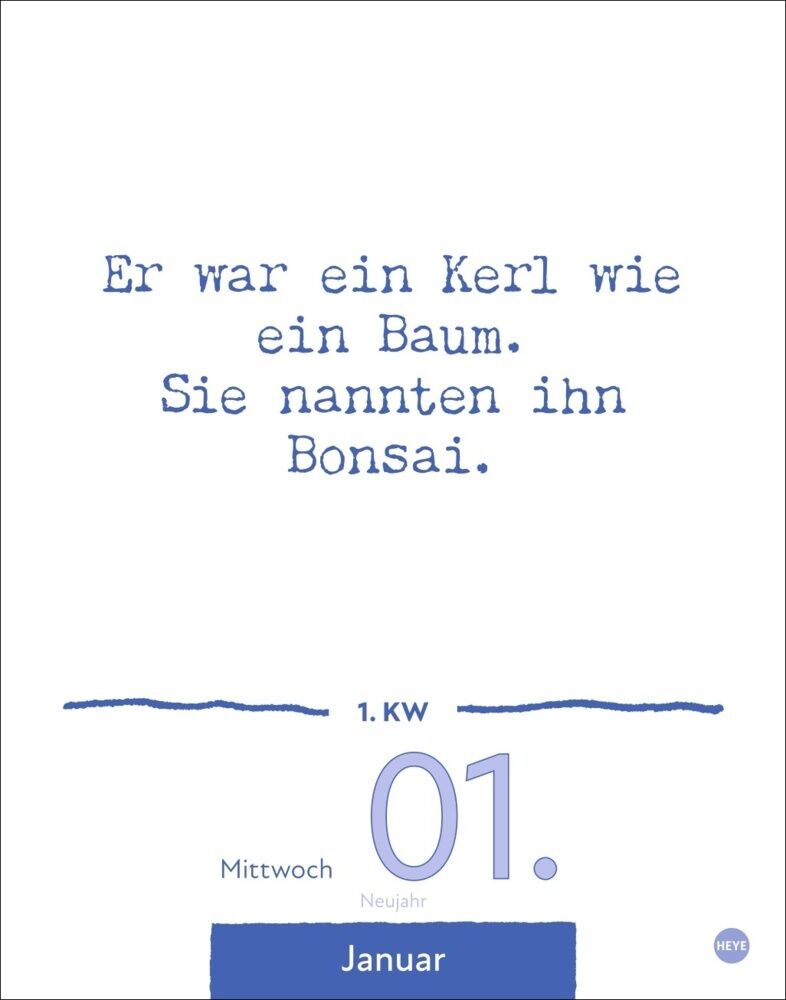 Schlagfertig und immer einen dummen Spruch auf den Lippen - mit diesem Tagesabreißkalender ist das ganz einfach. Tag für Tag. Dieser Kalender mit praktischem Aufsteller findet auf jedem Tisch seinen Platz, und das zu einem Spitzenpreis! Jeder Wochentag ein Kal...