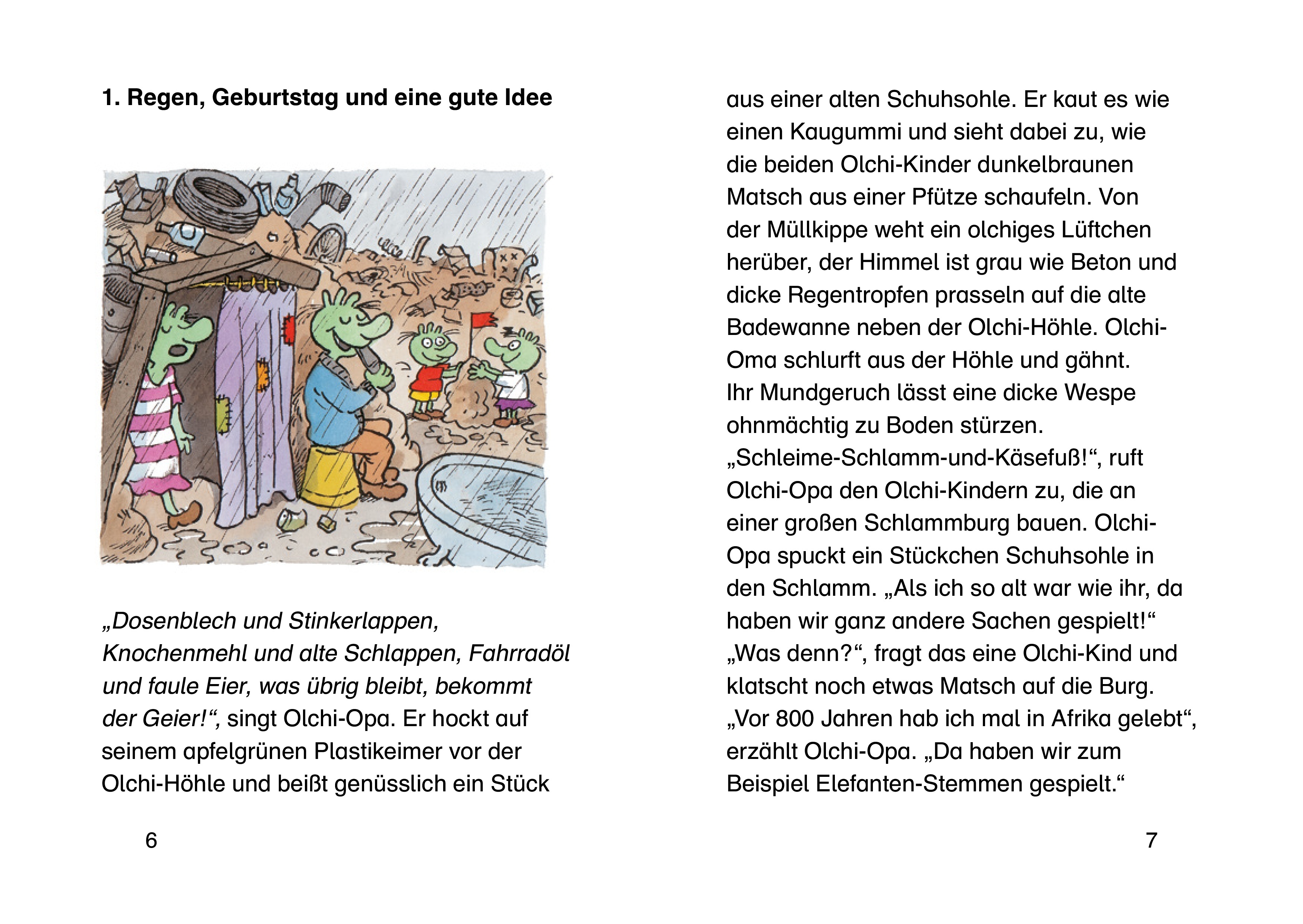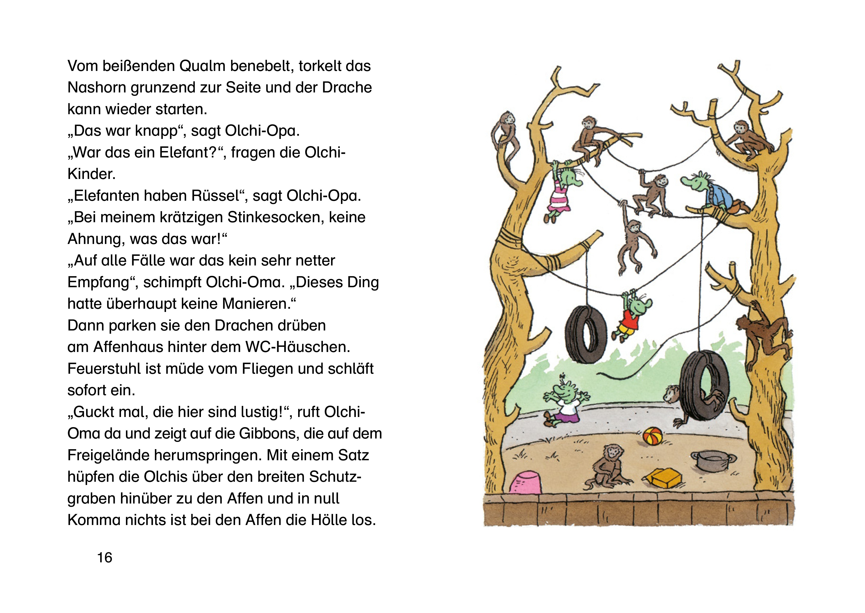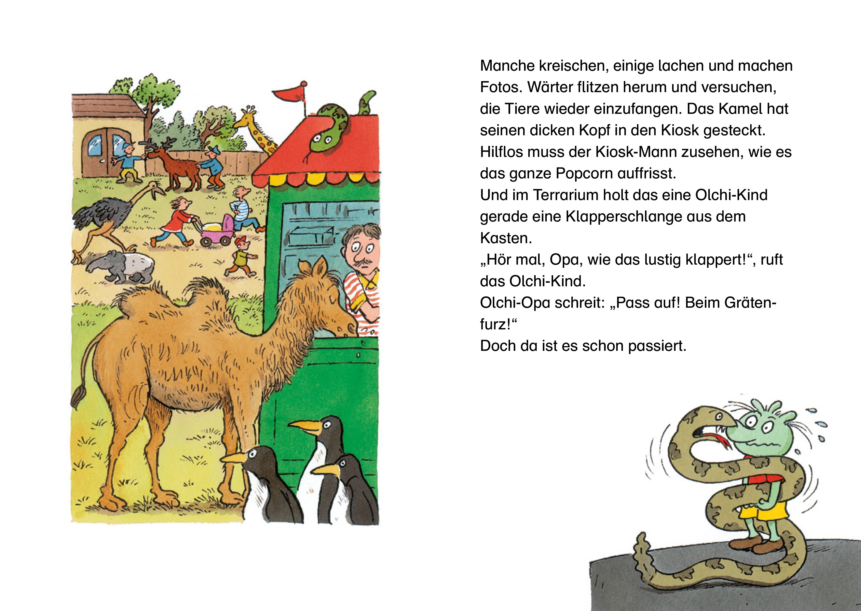 Krötiger Olchi-Spaß im Zoo. "Schlabber-Kröten-Furz! Ihr habt ja wohl gar keine Ahnung", raunzt der Olchi-Opa. Denn die Olchi-Kinder wissen nicht einmal, was ein Elefant ist. Das kann auch ein Olchi nicht durchgehen lassen und deshalb machen Olchi-Om...