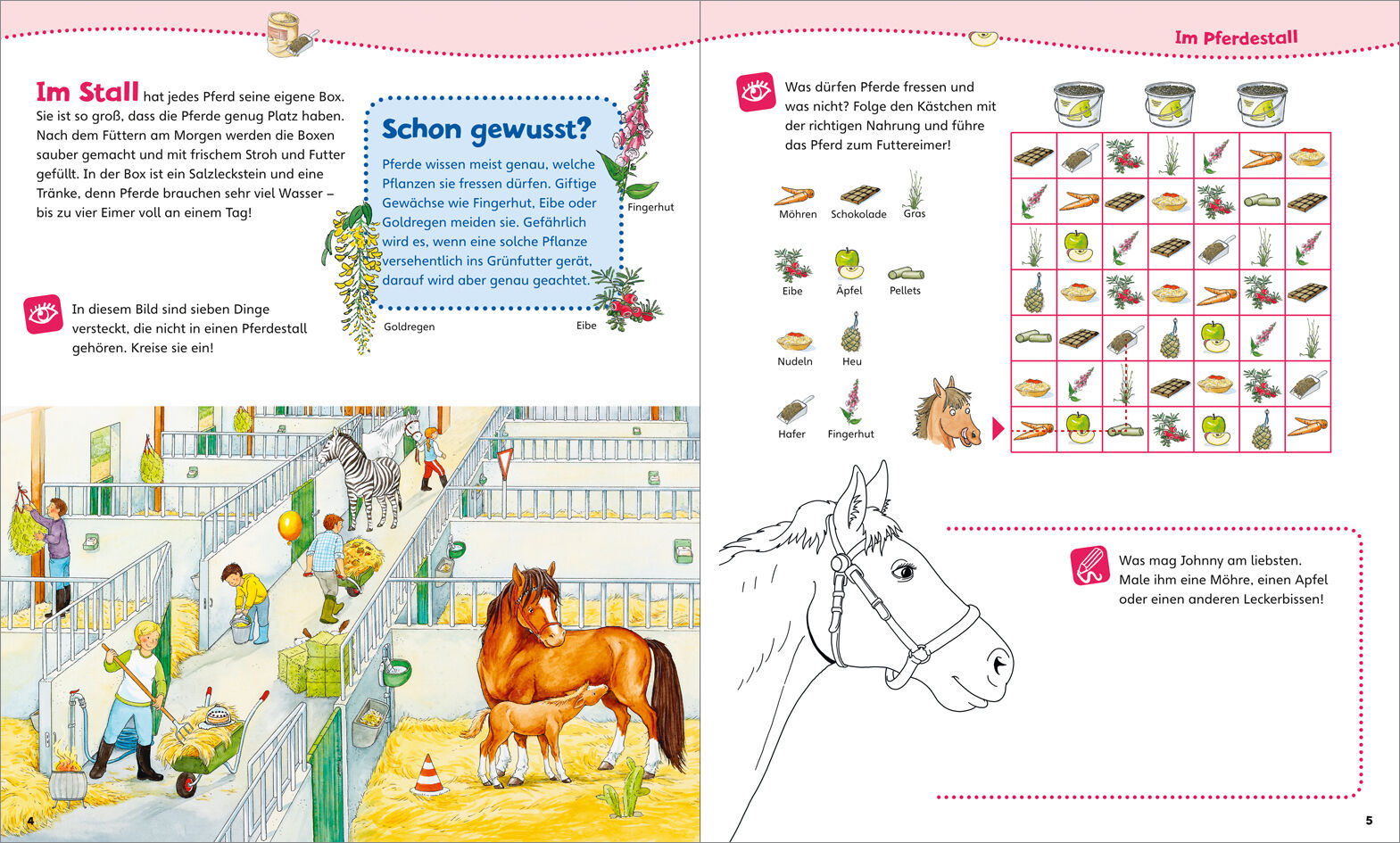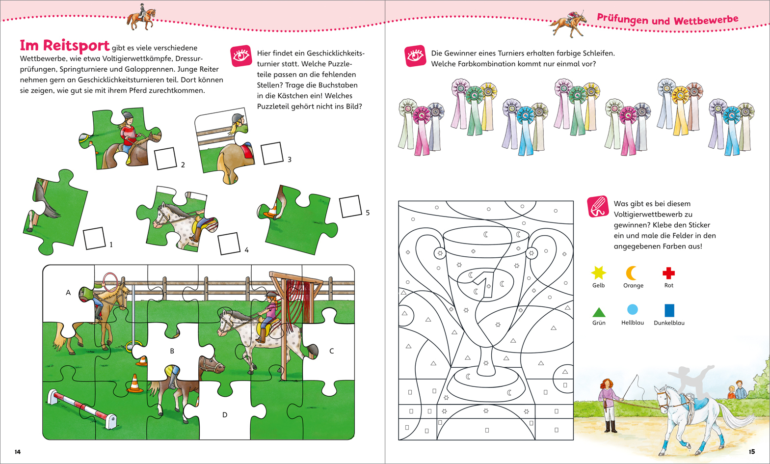 WAS IST WAS Junior Mitmach-Heft Pferde und Ponys Auf dem Reiterhof ist heute ein Fest. Einige Reiter zeigen das Voltigieren und man kann auf Ponys reiten oder die Pferde in den Boxen füttern und steicheln. Ergänze das Turnier-Puzzle! Male einen Leckerbissen fü...