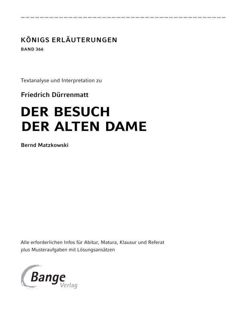 Der Besuch der alten Dame (1956) ist eine 'tragische Komödie' in drei Akten des Schweizer Schriftstellers Friedrich Dürrenmatt. Die Milliardärin und 'alte Dame' Claire Zachanassian besucht die verarmte Kleinstadt Güllen, in der sie einst ih...
