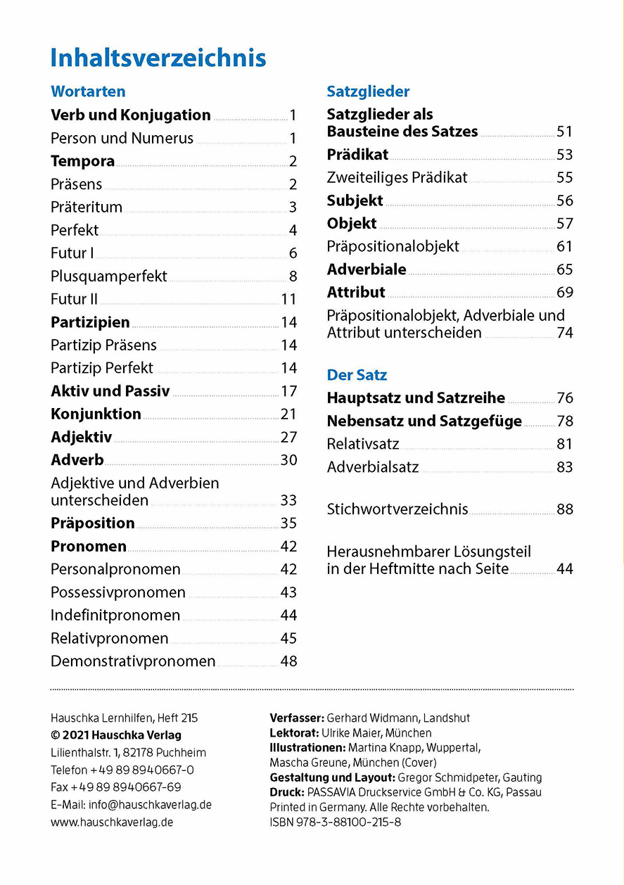 Diese Hauschka-Lernhilfe bietet einen Überblick über sämtliche Wortarten und Satzglieder. Zu jedem Kapitel gibt es zahlreiche Übungen, einen Merkkasten, in dem die wichtigsten Regeln festgehalten sind, sowie einen Zwischentest, um das Gelernte noch einmal zu ü...Diese Hauschka-Lernhilfe bietet einen Überblick über sämtliche Wortarten und Satzglieder. Zu jedem Kapitel gibt es zahlreiche Übungen, einen Merkkasten, in dem die wichtigsten Regeln festgehalten sind, sowie einen Zwischentest, um das Gelernte noch einmal zu überprüfen.