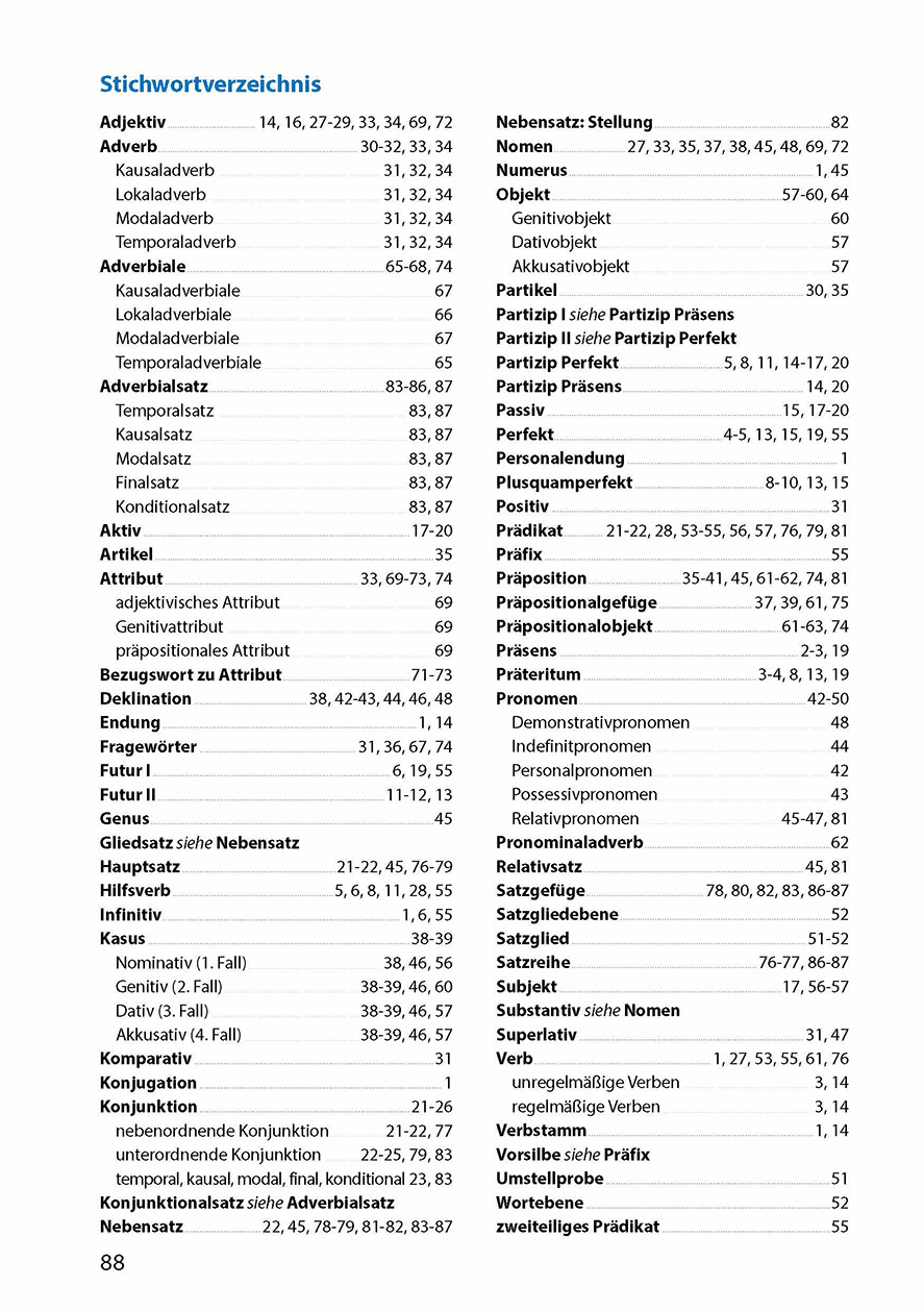 Eine Übersicht über den Lernstoff am Ende der Lernhilfe erklärt die einzelnen Grammatikbereiche auf einen Blick. Ein Abschlusstest gibt Aufschluss über den Lernerfolg. Der herausnehmbare Lösungsteil, die ausführlichen Erklärungen und ein umfangreiches Stichwortverzeichnis ermöglichen das selbstständige und gezielte Arbeiten der Schüler. Die deutsche Grammatik und ihre Besonderheiten sind ein komplexes Thema. Vielen Schülern fällt es daher schwer, Wortarten, Satzglieder und Satzarten im Deutschen richtig zu bestimmen. Dieses Heft bietet genau erklärte Regeln und viel Übungsmaterial zu den einzelnen grammatischen Gebieten. Darüber hinaus werden viele Tipps und Tricks angeboten, um bestimmte Fehler zu vermeiden (z.B. die Unterscheidung von Adjektiv und Adverb). Zwischentests zu jedem Kapitel geben Aufschluss über den Lernerfolg. Das Heft ist somit von der 5. bis zur 7. Klasse ein sinnvoller Begleiter für jeden Schüler.