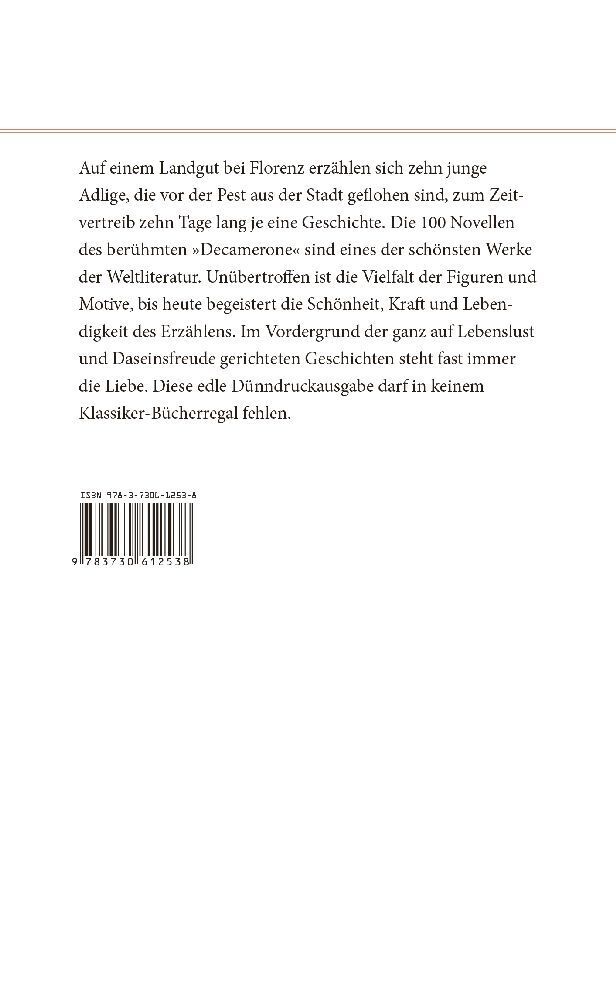 Auf einem Landgut bei Florenz erzählen sich zehn junge Adlige, die vor der Pest aus der Stadt geflohen sind, zum Zeitvertreib zehn Tage lang je eine Geschichte. Die 100 Novellen des berühmten »Decamerone« sind eines der schönsten Werke der Weltliteratur. Unübe...