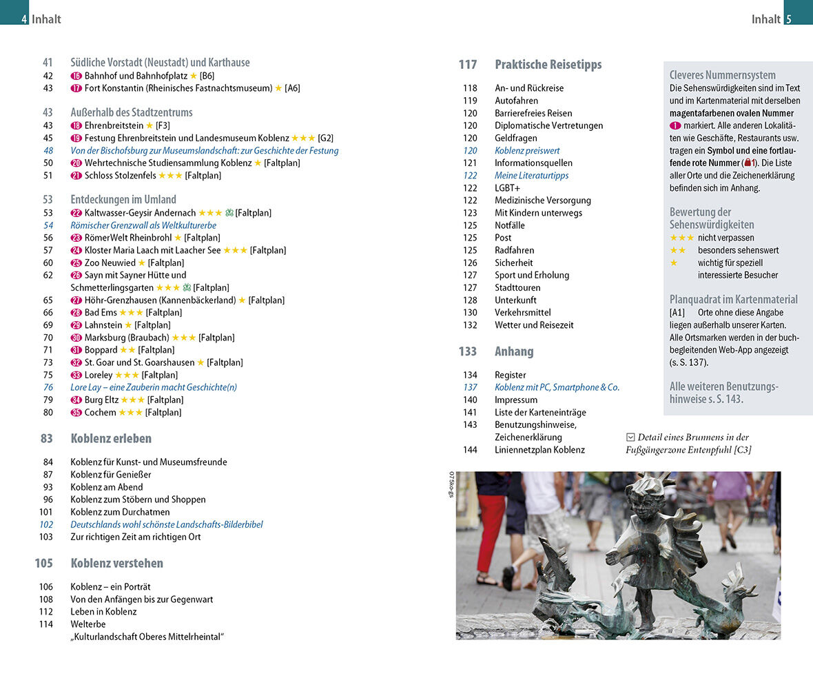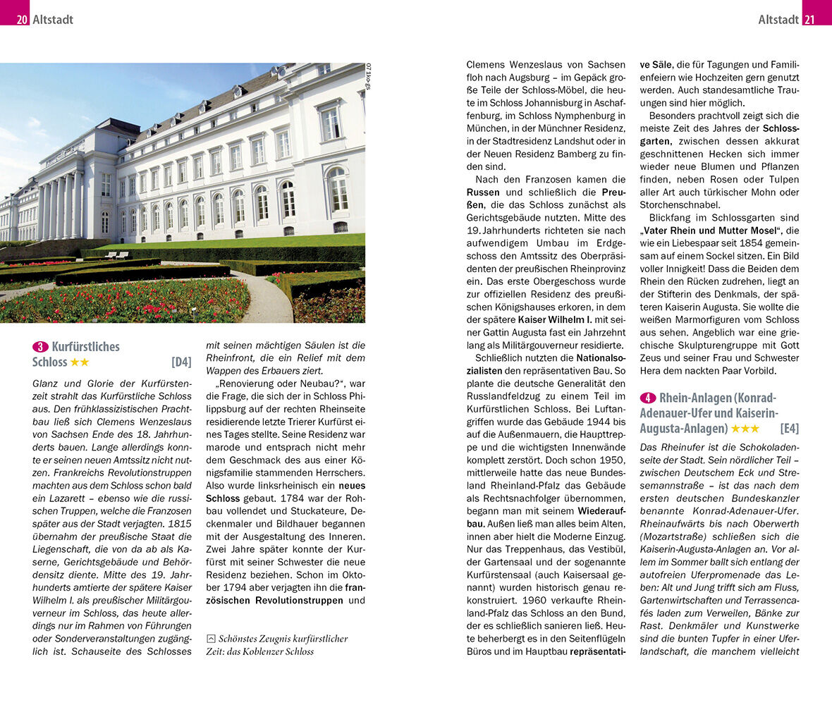 Römische Mauern, mittelalterliche Gebäude, das Kurfürstenschloss, sehenswerte Kirchen und mittendrin moderne Architektur: Koblenz hat viele Gesichter. Enge Gassen und kleine Plätze in der Altstadt laden zum Bummeln und zur Einkehr in gemütliche Lokale ein, da...