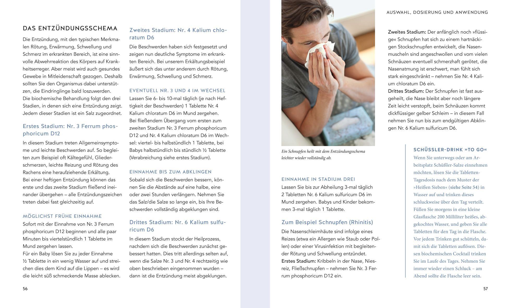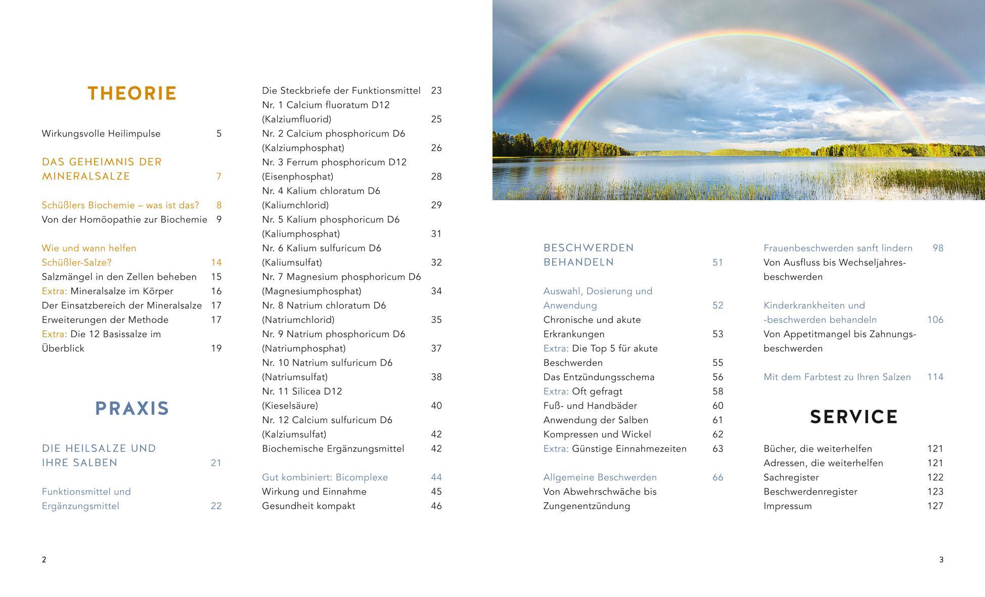 Im Praxis-Teil werden zunächst die zwölf Schüßler-Salze sowie die zwölf biochemischen Ergänzungsmittel vorgestellt. Sie erfahren hier, an welchen Körperfunktionen das jeweilige Mineralsalz beteiligt ist und bei welchen es unterstützend wirkt. Mithilfe einer Tabelle können Sie Ihre Beschwerden einem Krankheitsbild zuordnen und das richtige Mittel auswählen, das Linderung verspricht. Ein besonderer Fokus wird hierbei auf Frauenbeschwerden und Kinderkrankheiten gelegt.
