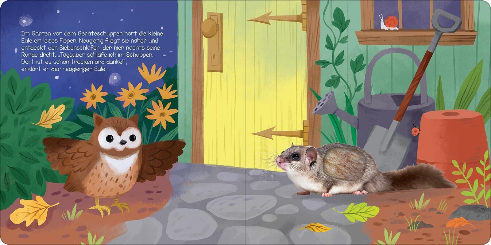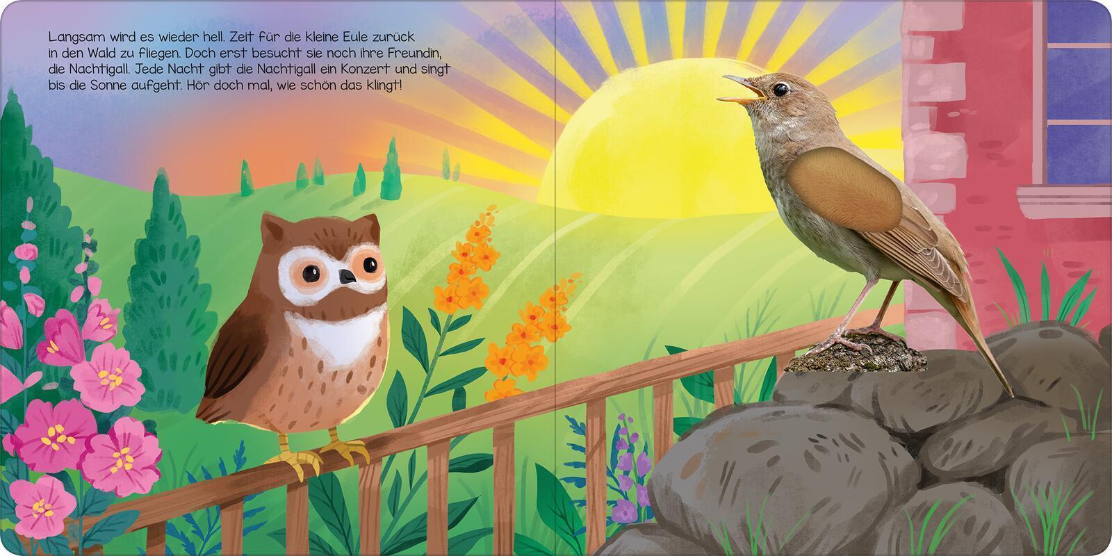 Schuhu, macht die kleine Eule. Neugierig fliegt sie durch die Nacht und besucht ihre tierischen Freunde. Was machen der Luchs, der Waschbär und die Nachtigall für Geräusche? Und wie klingt eigentlich der Siebenschläfer? Streichle über sein Fell und finde es heraus.