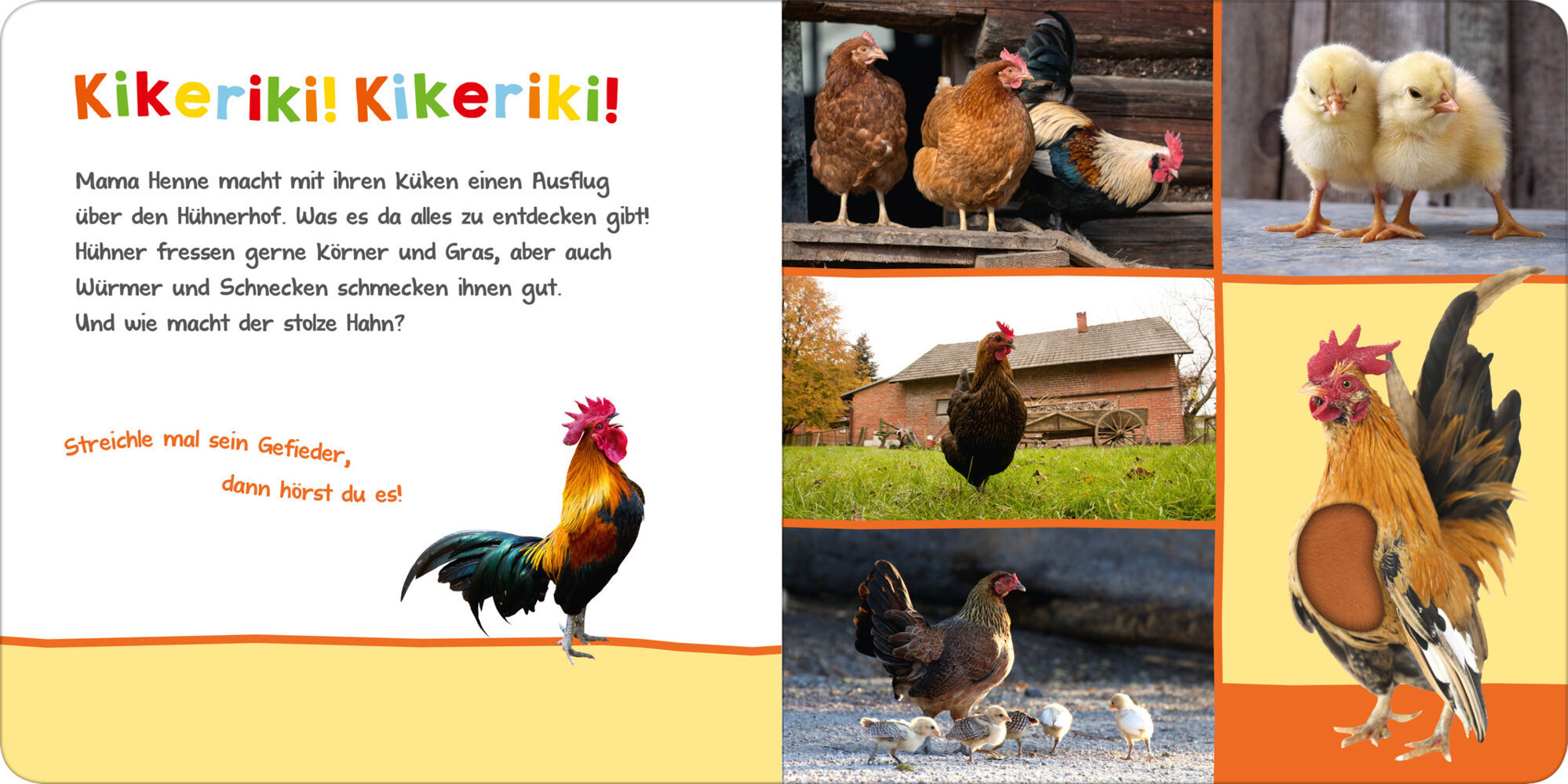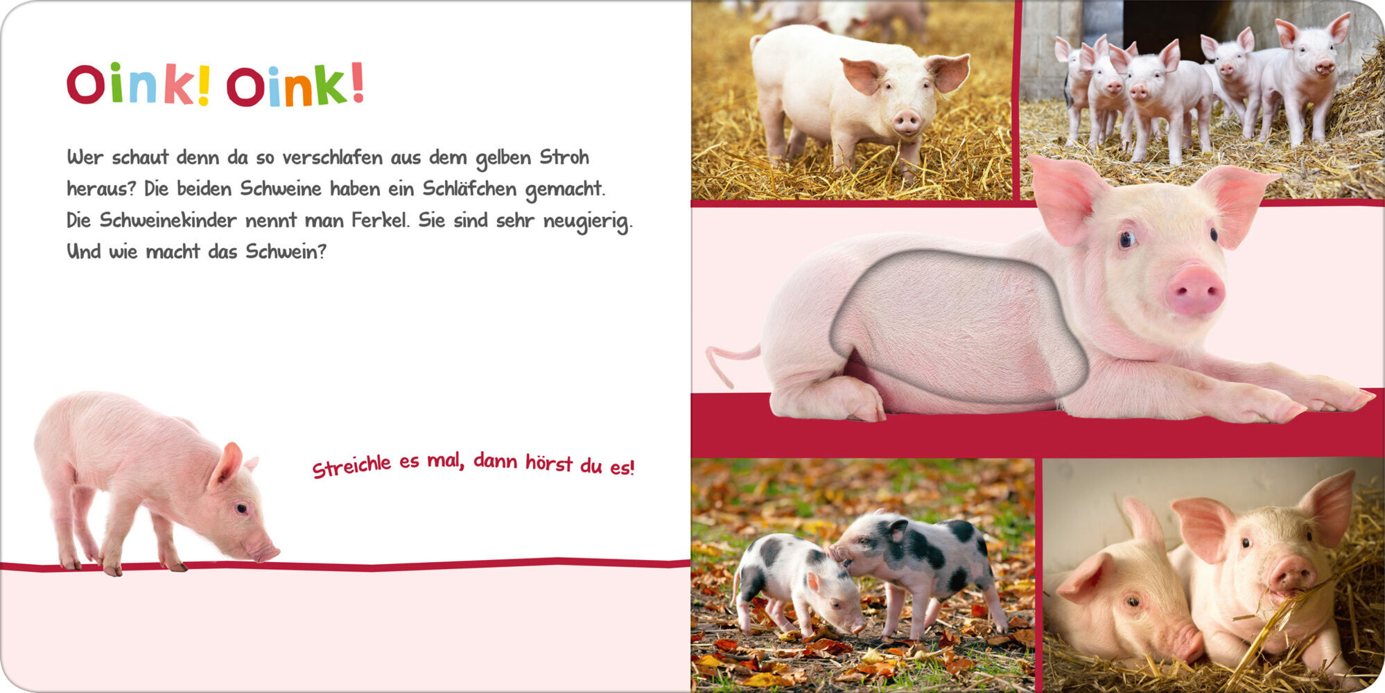 Hör mal rein, wer kann das sein - Im Stall Wie macht das Schwein? Das Schweinchen macht oink, das Schaf mäht und die Schwalbe zwitschert fröhlich. Doch wie klingen der Esel und der Hahn? Hier kannst du es entdecken. Einfach über das kuschelweiche Fell der Tier...