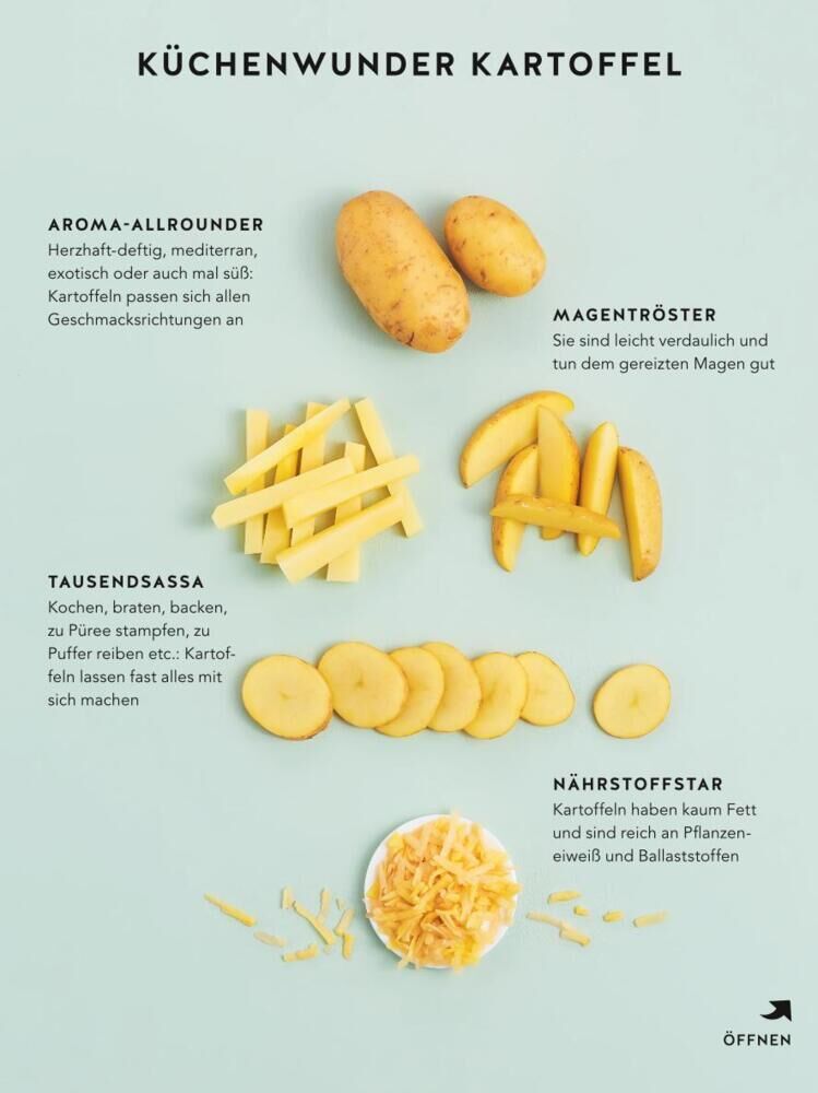 die gelbe Knolle begeistert mit ihrer Vielseitigkeit zu jeder Tageszeit. Denn sie kann nicht nur herzhaft auch süße Kombinationen sind möglich. Die Schnupfnudeln mit Kirschen werden von Kindern heiß geliebt, während Berufstätige den schnellen Kartoffel-Bohnen-Eintöpf kochen und schon nach 25 Minuten essen können. In vier Kategorien zeigt die Autorin bestimmt auch Ihnen Ihren Favoriten:
