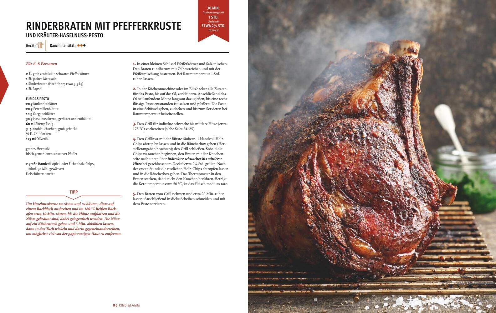 Fleisch: Ein klassisches Rezept für den Smoker-Grill ist zum Beispiel der "Rinderbraten mit Pfefferkruste und Kräuter-Haselnuss-Pesto". Das Fleis