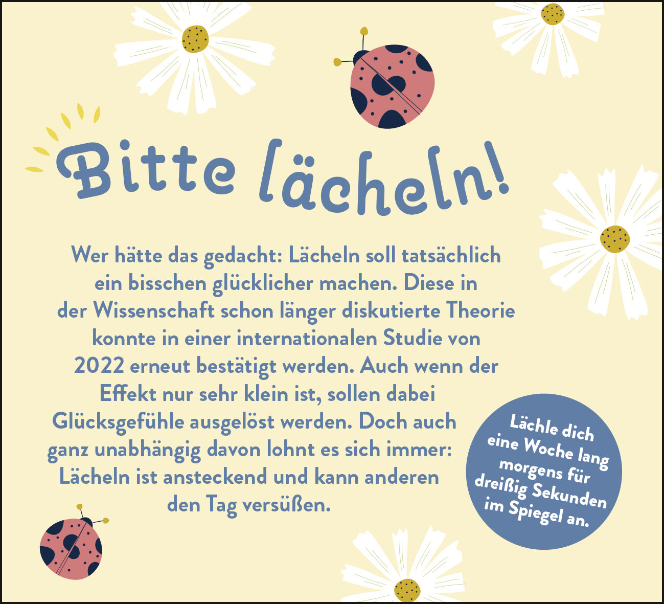 Inspirierender Aufsteller mit 50 Anregungen für mehr Glücksgefühle Wusstest du, dass Lächeln glücklich macht? Und das Beziehungen zu anderen eine der größten Glücksquellen sind? Das inspirierende Aufstellbuch gibt dir 50 alltagsnahe Anregungen und Ideen, wie ...