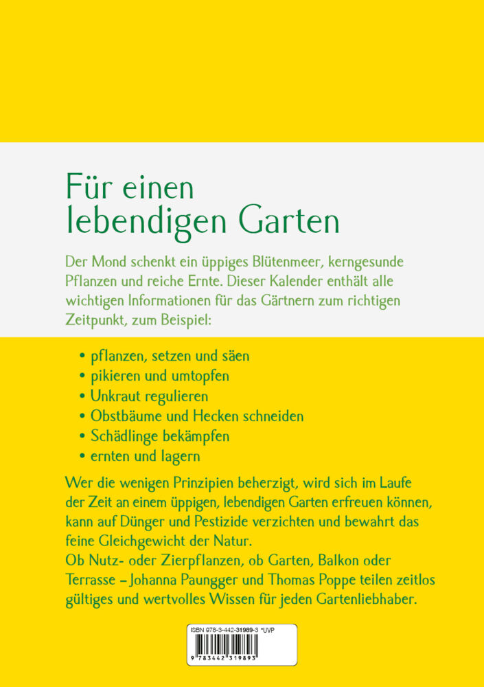 Gärtnern mit dem Mond Der Mond schenkt ein üppiges Blütenmeer, kerngesunde Pflanzen und reiche Ernte. Dieser Kalender enthält alle wichtigen Infos für das Gärtnern zum richtigen Zeitpunkt. Ob für Aussaat, Pflege, Vermehrung, Schädlingsbekämpfung oder Unkrautre...