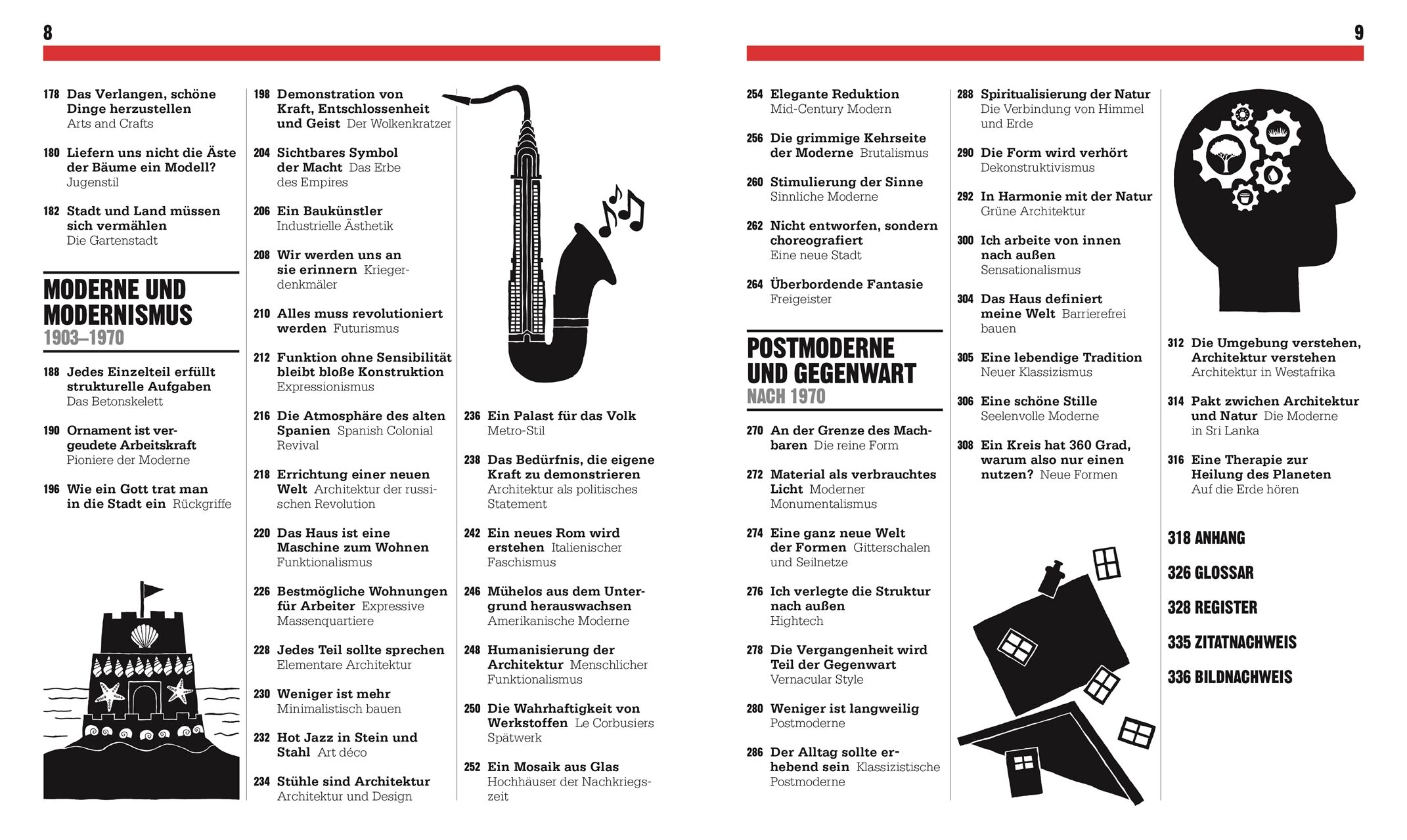 • Die Geschichte der Architektur in sechs großen Kapiteln: Das Aufkommen der Architektur; Das Mittelalter; Von der Renaissance bis zur Wiederbelebung; Das Industriezeitalter; Die Moderne und die Alternativen; Postmodern und zeitgenössisch