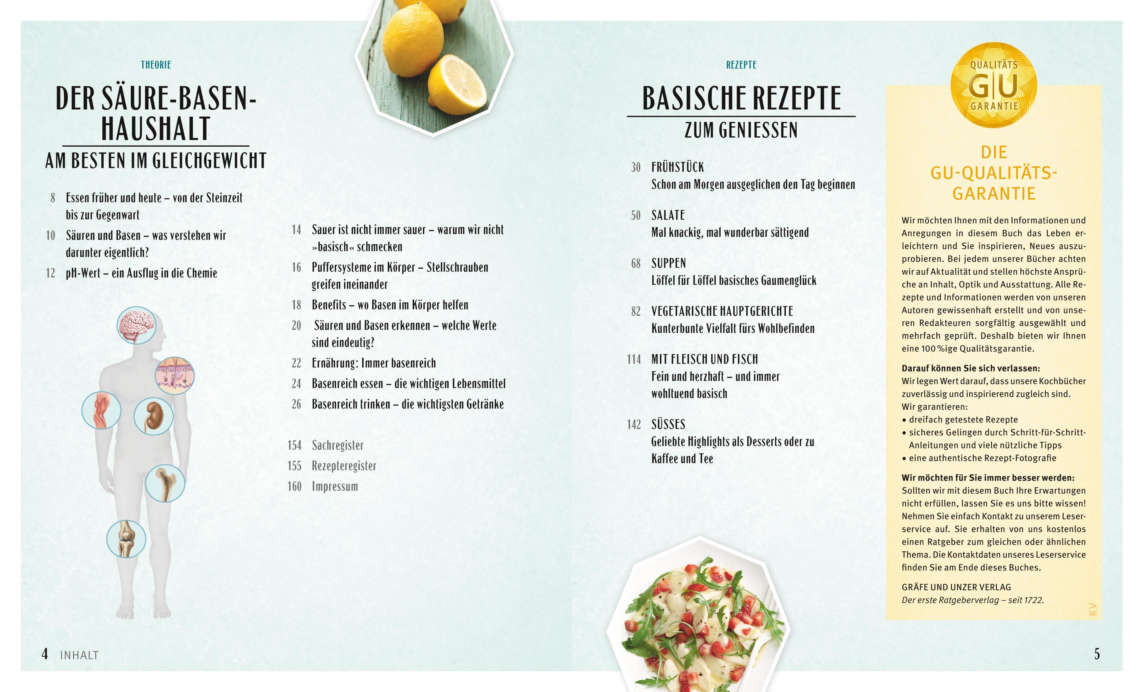 Das Erfolgsrezept gegen Übersäuerung des Körpers: Karola Wiedemann hat auf der Grundlage neuester wissenschaftlicher Erkenntnisse von Prof. Dr. Vormann die Zutaten für die basische Ernährung so ausgewogen kombiniert, dass wir nicht einmal auf Fleisch verzichten müssen. Und wir schwelgen in Gemüse, Kartoffeln, Fisch, Obst und sogar Kuchen - und tun dabei mühelos etwas für unsere innere Balance. Ob Frühstück, Snacks, Salate, Suppen, Hauptgerichte oder Desserts - das Säure-Basen-Kochbuch macht uns den Einstieg in die basische Ernährung lecker und leicht. Hier ein paar Beispiele: