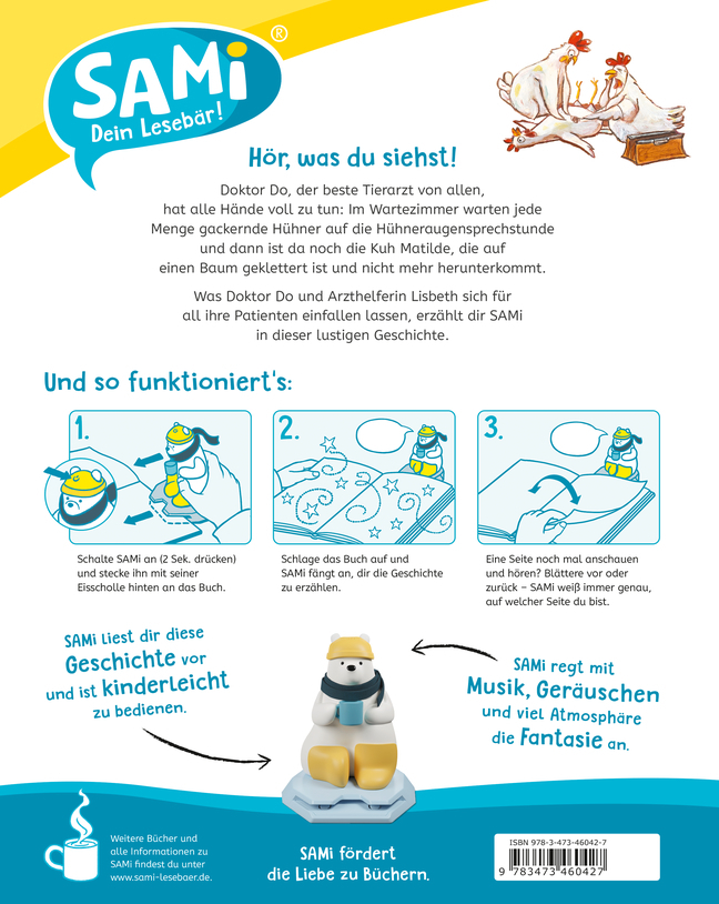 Erlebe mit SAMi ein Lese-Abenteuer! Doktor Do hat alle Hände voll zu tun: Im Wartezimmer warten jede Menge gackernde Hühner auf die Hühneraugensprechstunde und dann ruft auch noch Bauer Hinnerk an: Die Kuh Matilde ist auf einen Baum geklettert und kommt nicht ...