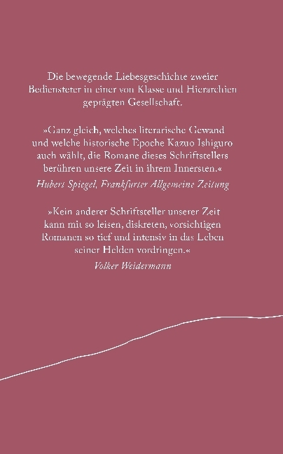 Der erfolgreichste Roman des Literaturnobelpreisträgers in edler Leinenausstattung Stevens dient als Butler in Darlington Hall. Er sorgt für einen tadellosen Haushalt und ist die Verschwiegenheit in Person: Niemals würde er auch nur ein Wort über die merkwürdi...