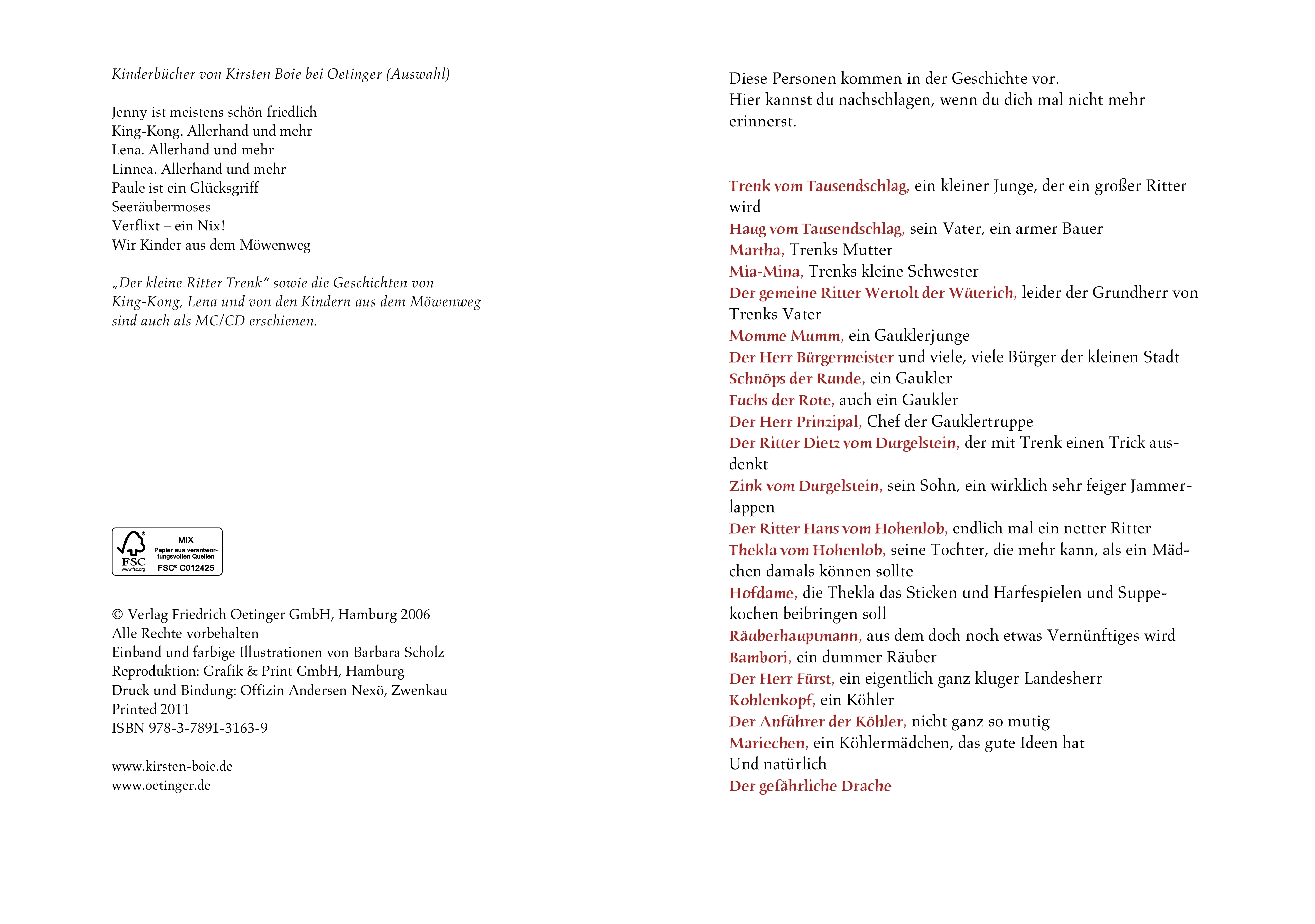 Leibeigen geboren, leibeigen gestorben, leibeigen ein Leben lang - ja, so heißt es wohl! Aber ist es nicht schrecklich ungerecht, das alle Bauern ihrem Ritter gehören und kein bisschen sich selbst? Das findet jedenfalls der Bauernjunge Trenk. Er will es einmal besser haben als sein Vater, der schon wieder auf der Burg Schläge bekommen soll. Und so bricht Trenk mit seinem Ferkelchen am Strick auf in die Stadt, um dort sein Glück zu machen. Doch so einfach, wie Trenk sich das vorgestellt hat, ist es nicht mit dem Glück - gut, dass er auf seinem Weg immer wieder Freunde findet, die ihm weiterhelfen. Und wer hätte gedacht, dass der kleine Ritter Trenk vom Tausendschlag schließlich sogar gegen den gefährlichen Drachen ins Feld ziehen wird?