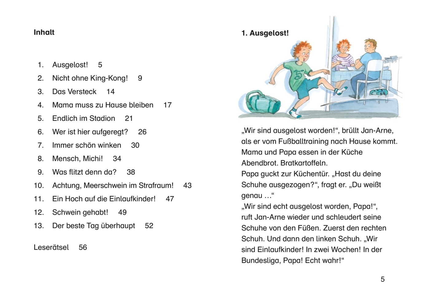 Jan-Arne ist ganz aufgeregt: Seine Fußballmannschaft wurde ausgelost, um bei einem richtigen Bundesligaspiel zusammen mit seiner Lieblingsmannschaft ins Stadion einzulaufen. So nah waren Jan-Arne und Michi ihren Fußballhelden noch nie! Klar, dass auch King-Ko...