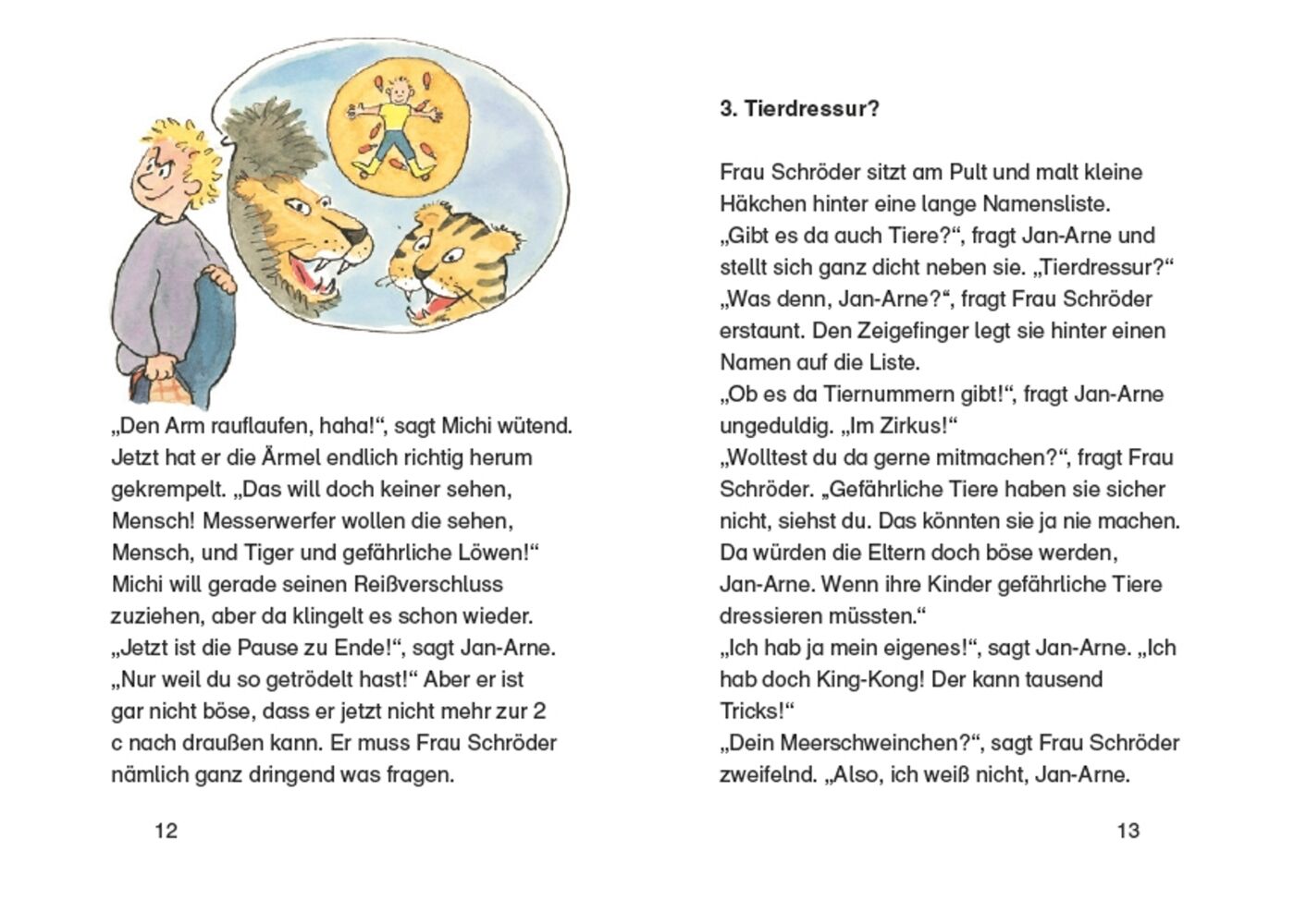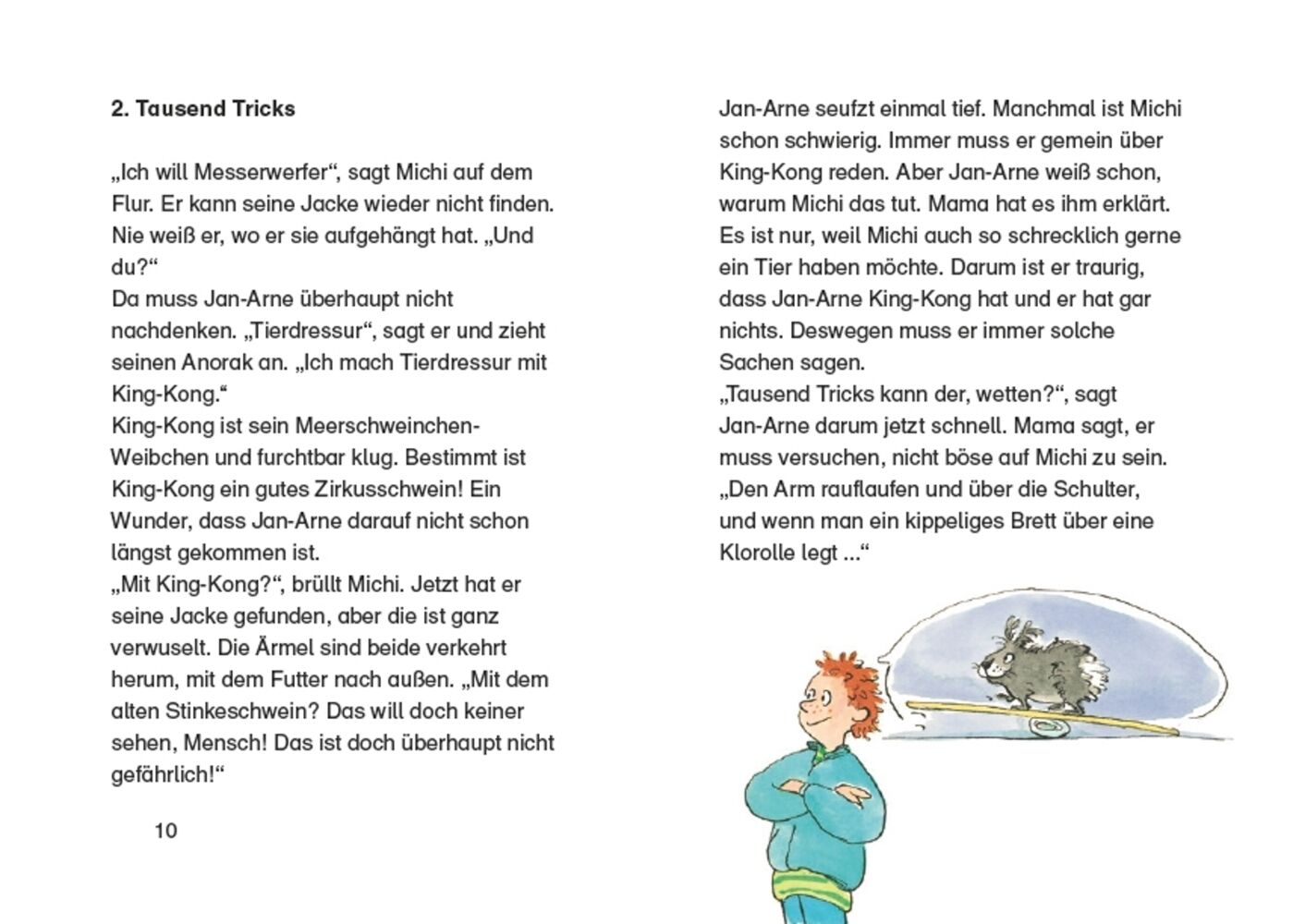 In "King-Kong, das Zirkusschwein" von Kirsten Boie erleben Leser*innen ein humorvolles und herzerwärmendes Abenteuer, das im Kontext eines Schulzirkus spielt. Jan-Arne, der Hauptprotagonist, freut sich darauf, sein talentiertes Meerschweinchen King-Kong vorführen zu können, das tausend Tricks beherrscht. Die Vorfreude wird jedoch jäh unterbrochen, als er erfährt, dass er stattdessen eine störrische Ziege namens Wilma dressieren soll. Dieser unerwartete Wechsel stellt Jan-Arne vor neue Herausforderungen, zeigt aber auch, wie er mit Kreativität und Entschlossenheit versucht, das Beste aus der Situation zu machen. Die Geschichte vermittelt auf unterhaltsame Weise wichtige Werte wie Flexibilität, Teamarbeit und die Bedeutung von Freundschaft.