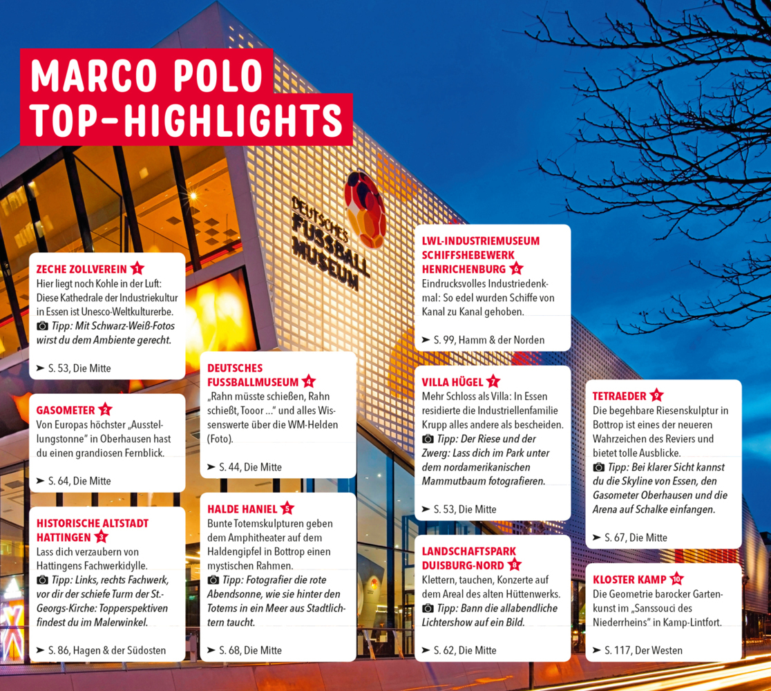Wirf einen Blick hinter die Industriekulissen mit dem MARCO POLO Reiseführer Ruhrgebiet Wunderschöne Natur und pulsierendes Stadtleben: Im Ruhrgebiet erwartet dich jede Menge Abwechslung! Erkunde stillgelegte Industriegelände, lass dich verzaubern von Hatting...