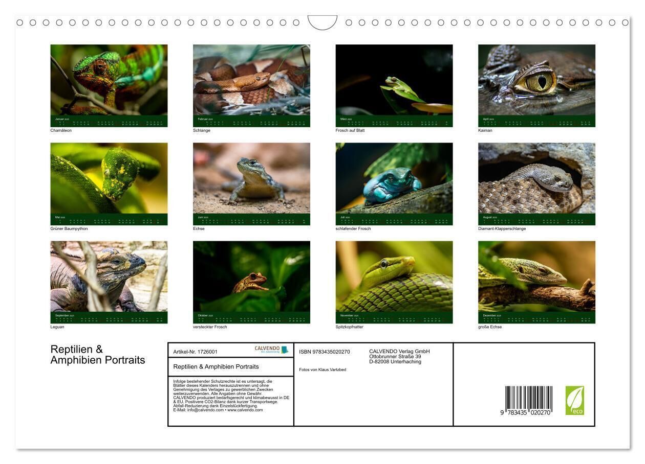 Kalender für das ganze Jahr mit Nahaufnahmen und Portraits von Reptilien und Amphibien. Schlangen, Frösche, Chamäleon, Echsen und Kaiman in unterschiedlichen Größen verfügbar. Diese Kalenderbilder, vom Fotografen Klaus Vartzbed, eignen sich im auch als Poster....