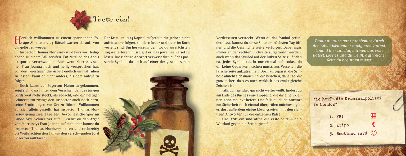 Ein Escape-Adventskalender für Einsteiger: Inspector Morrissey ermittelt kurz vor Weihnachtn in einem alten herenhaus, in dem ihn ein schwerer Schneesturm gefangen hält. Ein Adventskalender für Erwachsene LeserInnen und Rätselfans. In 24 Kapiteln wird die span...