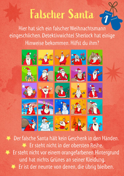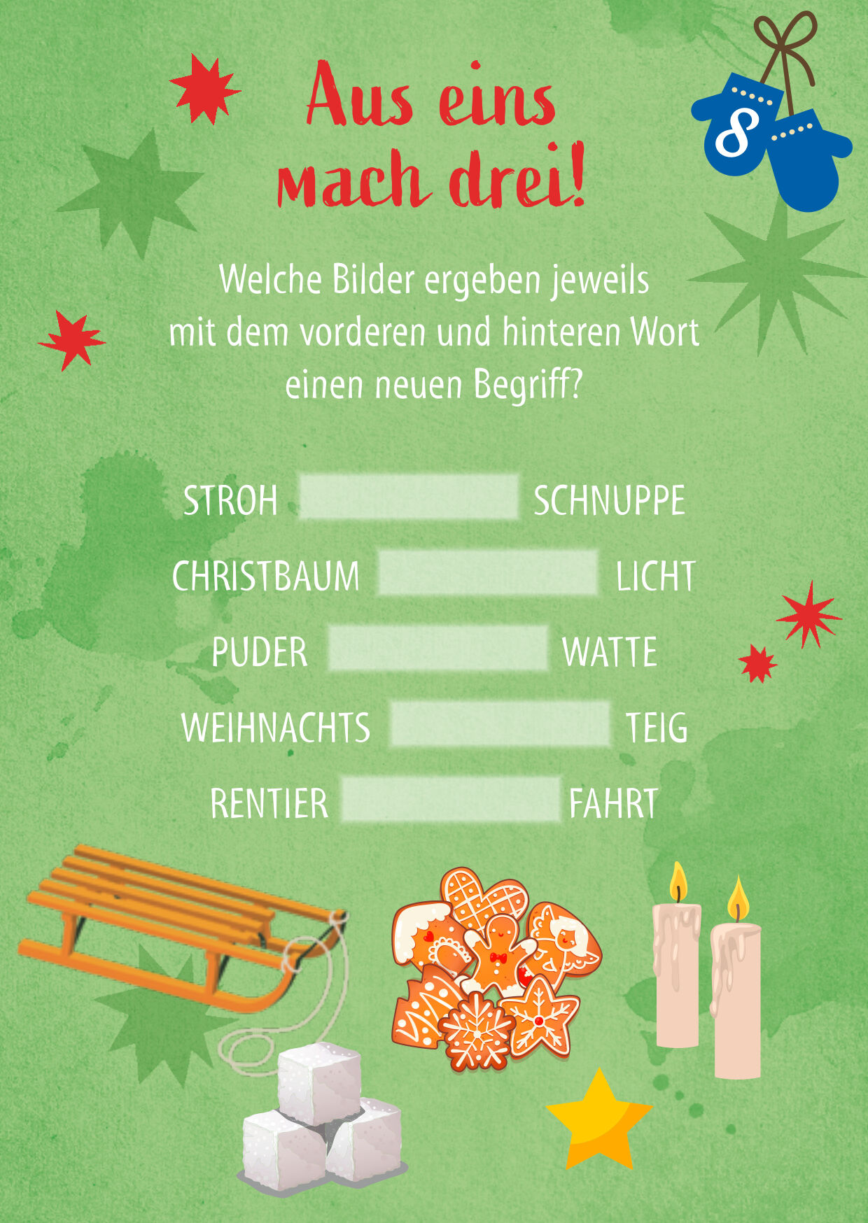 24 Rätsel für den Advent - Ein Adventskalender für Kinder ab 8 Jahren. Dieser handliche Adventskalender hält für jeden Tag im Advent ein kniffeliges Rätsel und außerdem eine weihnachtliche Kleinigkeit zum Ausmalen bereit. Worträtsel, Zahlenrätsel, Sudoku, Bild...