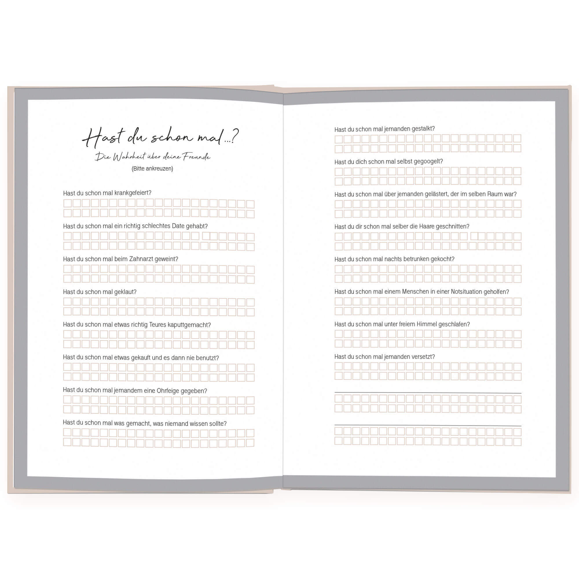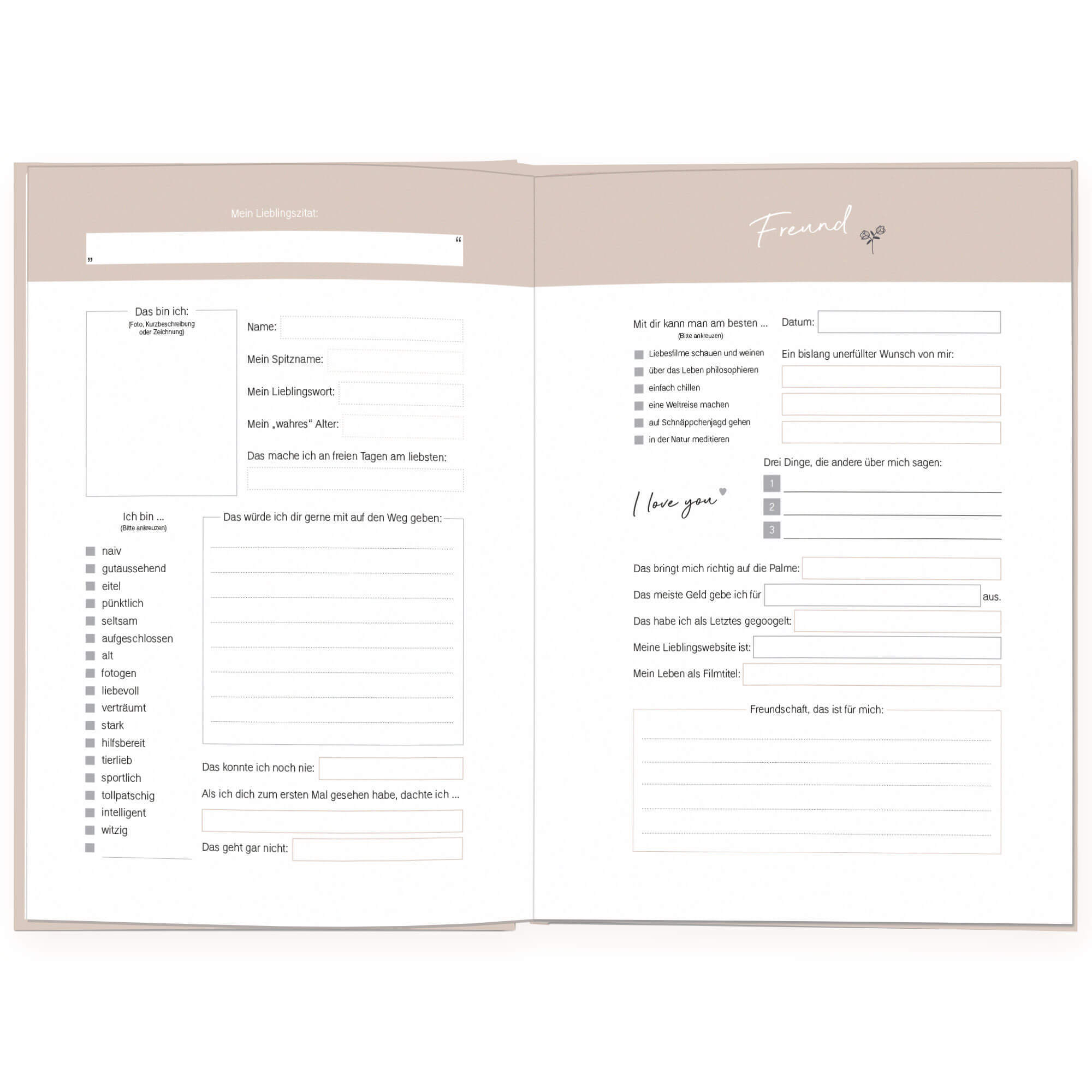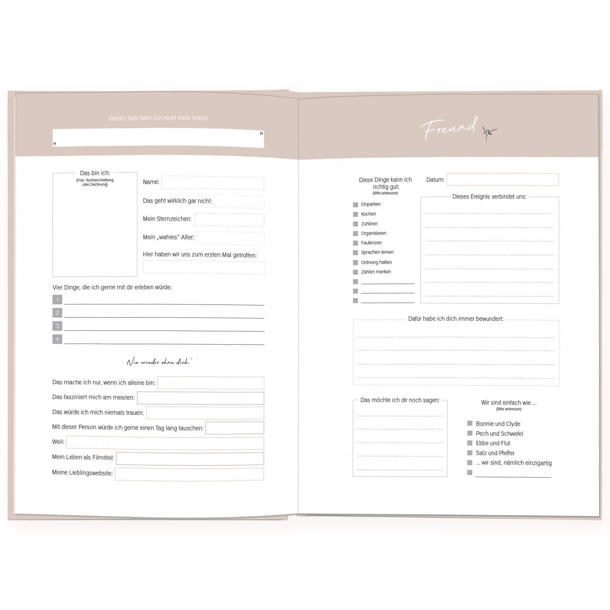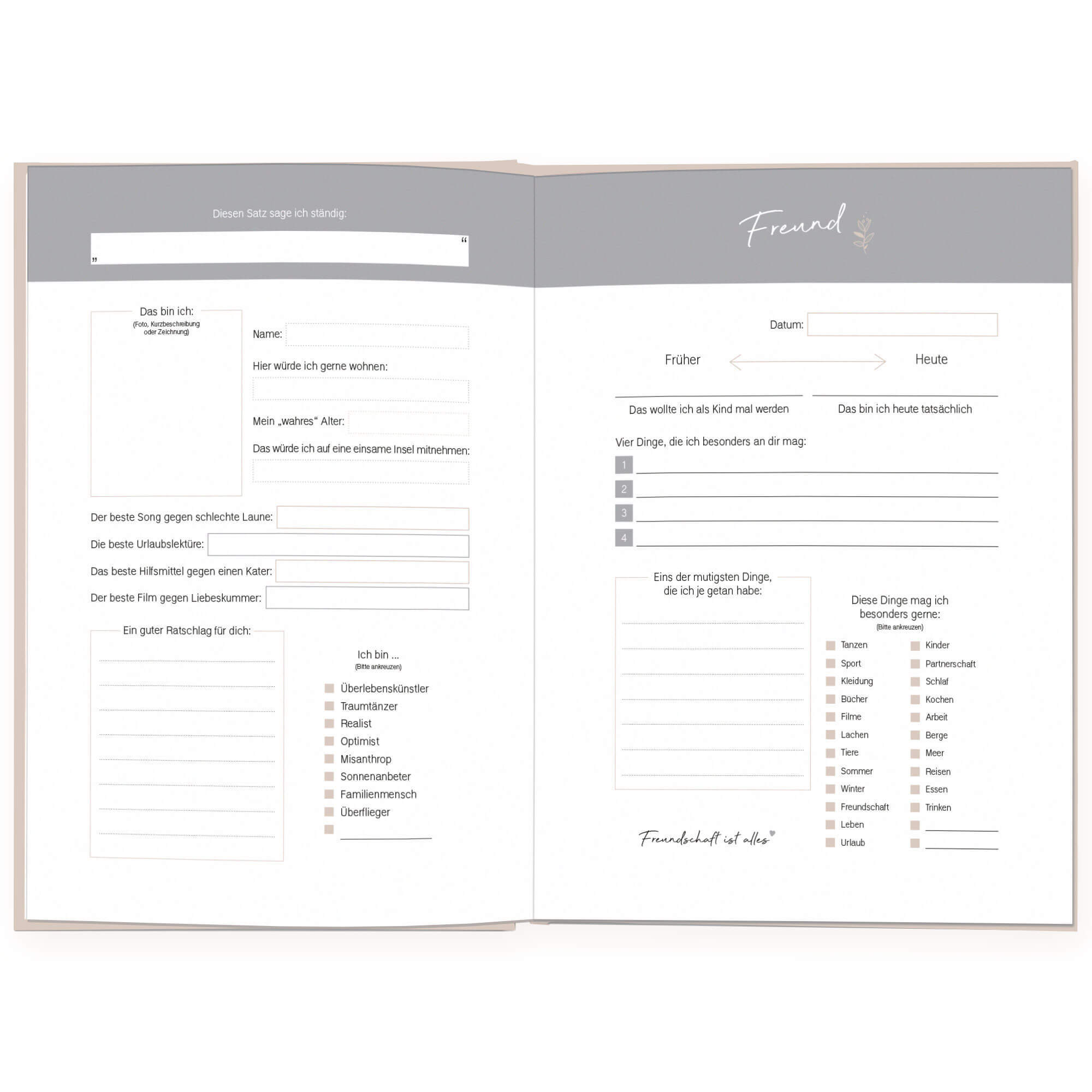 Erinnerst du dich noch, wie aufregend es für dich als Kind war, dein Freundebuch zurückzubekommen? Gespannt hast du die persönlichen Einträge deiner Freunde durchstöbert. Mit dem Freundschaftsbuch für Erwachsene lassen wir diesen Brauch wieder aufleben. Deine ...