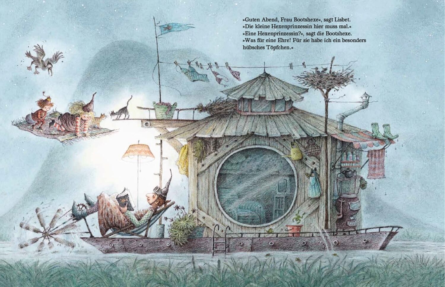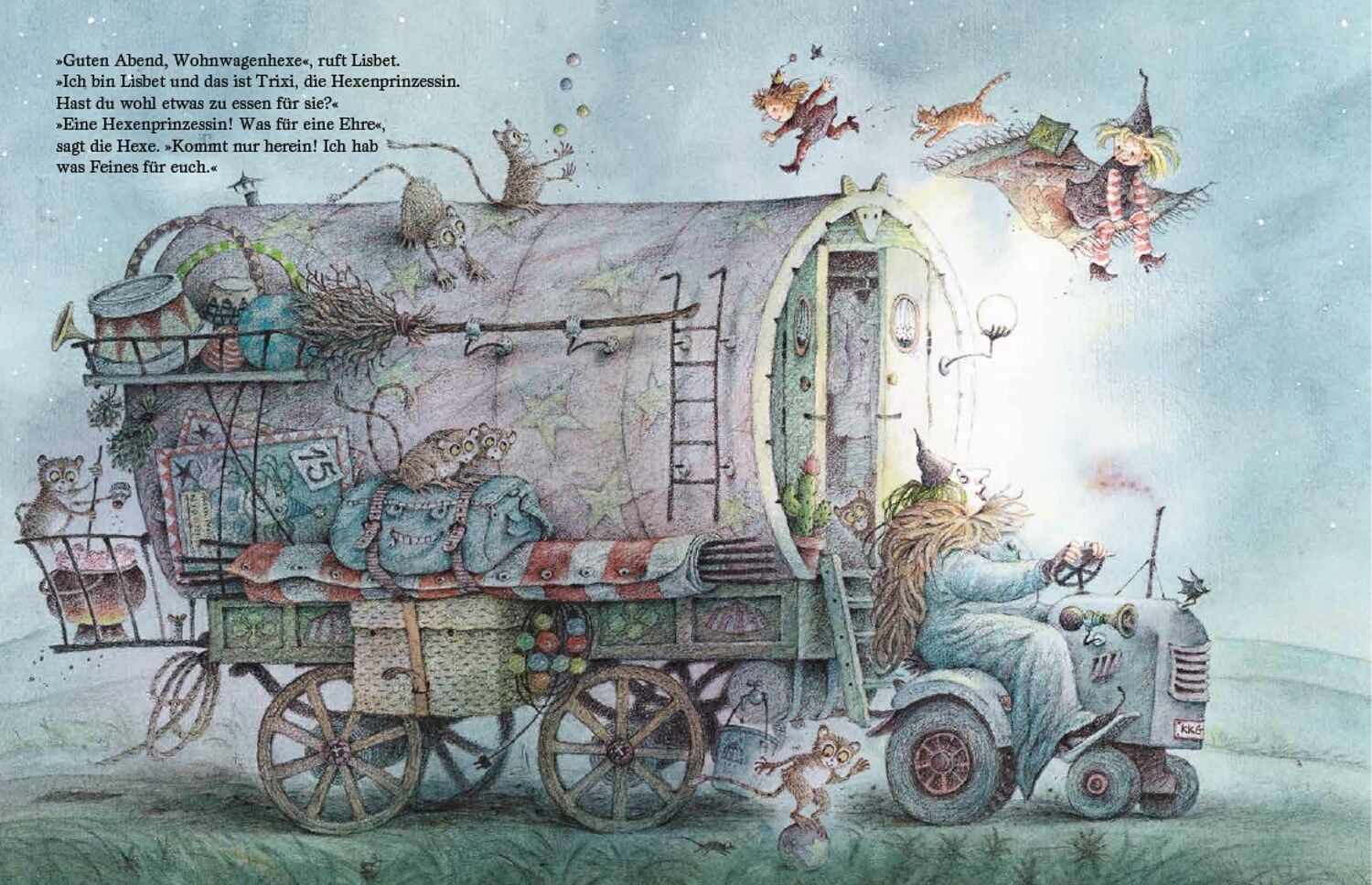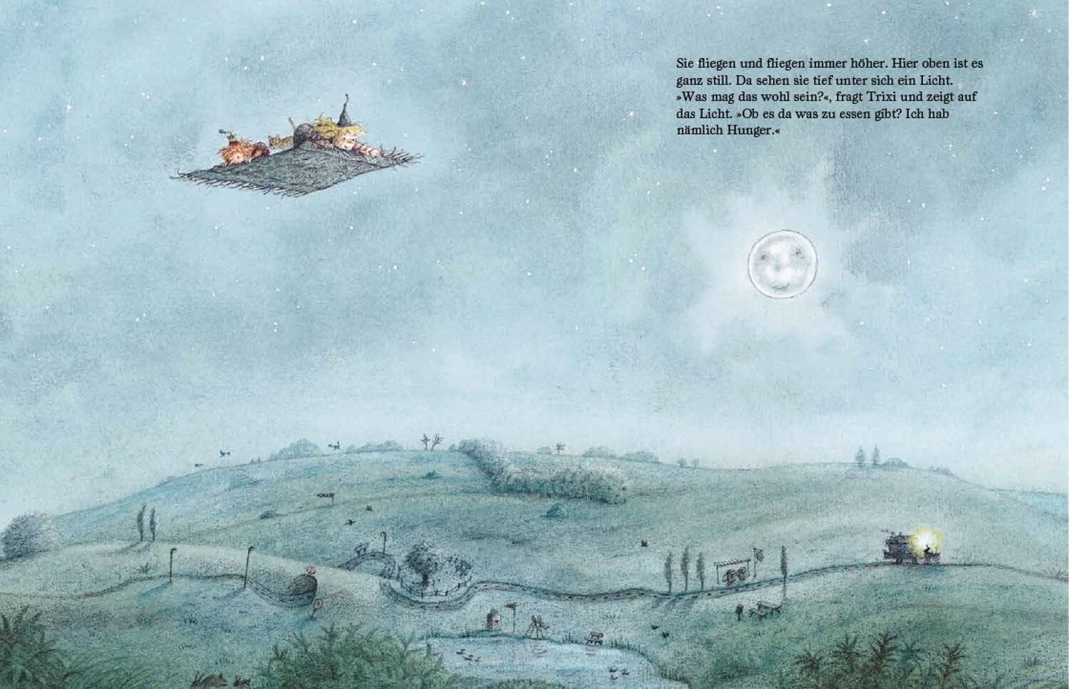 Lisbet, die kleine Hexe, hat Besuch von Trixi, dem Hexenkind. Und da man seinem Besuch bekanntlich was bieten muss, zaubert die kleine Hexe Lisbet kurzerhand einen fliegenden Teppich herbei, erklärt Trixi zur Hexenprinzessin und fliegt mit ihr - hastdunichtgesehen - in die Vollmondnacht hinaus. Schneller als alle Hexenbesen der Welt saust der Teppich mit den zwei Hexlein über Berge und Täler, über Flüsse, Seen und Wälder. Wie Hexenkinder das so an sich haben, kriegt Trixi zwar irgendwann Hunger, und irgendwann muss sie sogar Pipi, aber für Lisbet ist das alles kein Problem. Als plötzlich keine Berge und Täler, keine Flüsse, Seen und Wälder mehr zu sehen sind, weil der Mond sich hinter den Wolken versteckt hat, ist Lisbet zum ersten Mal ratlos. Und wenn sie nicht schließlich die Ballonhexe getroffen hätten, wären die beiden, wer weiß, vielleicht heute noch unterwegs ...